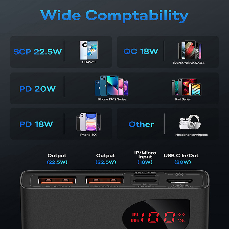 این پاوربانک دارای دو پورت یو اس بی و یک درگاه تایپ سی می باشد و با دستگاه هایی مانند Xiaomi، Huawei ، Apple ، Somsung و... سازگار است و به شما این امکان را می دهد که 50 درصد باتری گوشی خود را تنها در نیم ساعت شارژ کنید.