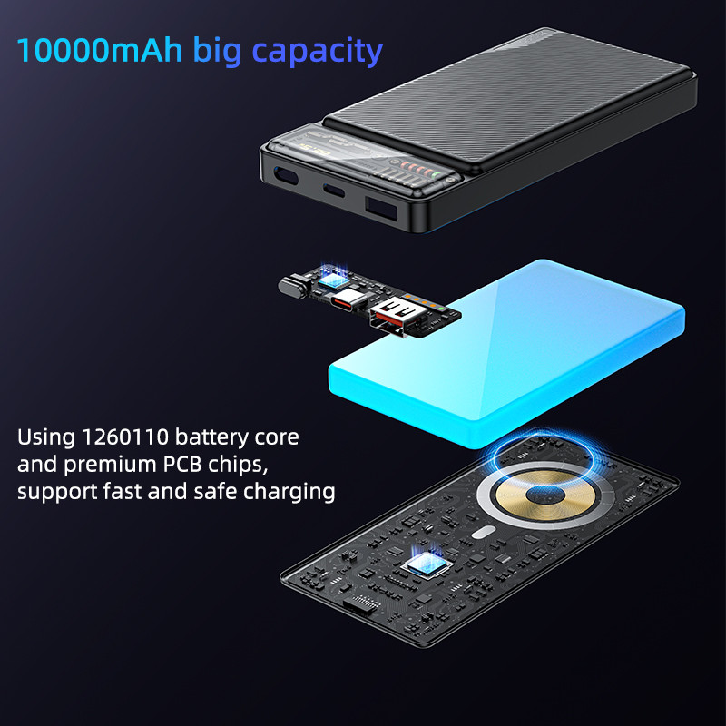 بهره مند از یک عدد درگاه ورودی Type-C (مشترک) و کابل تایپ سی به منظور شارژ کردن پاوربانک است.دارای باتری پلیمری با ظرفیت اسمی 10000 میلی آمپر ساعت، دارای قابلیت استفاده در هواپیما است.