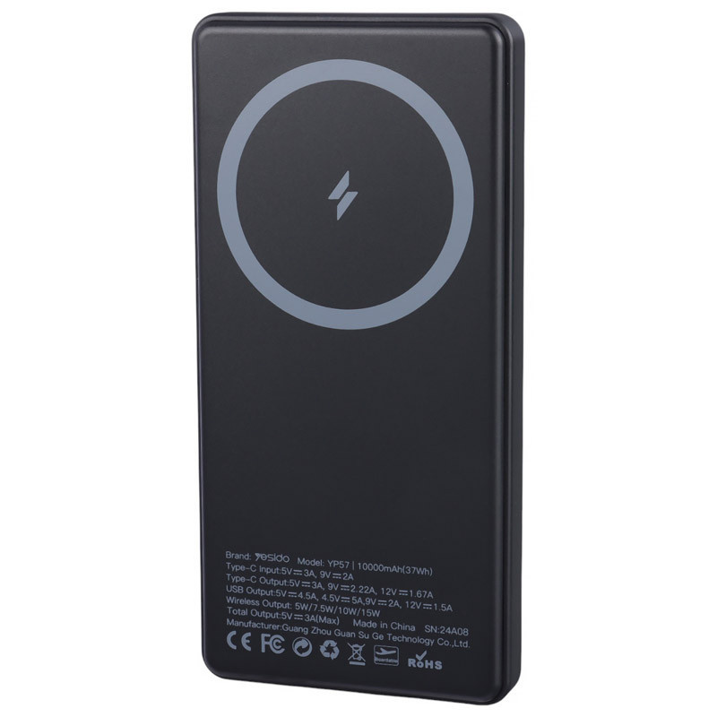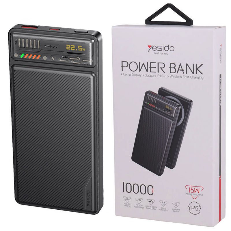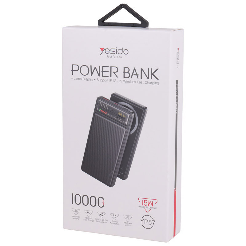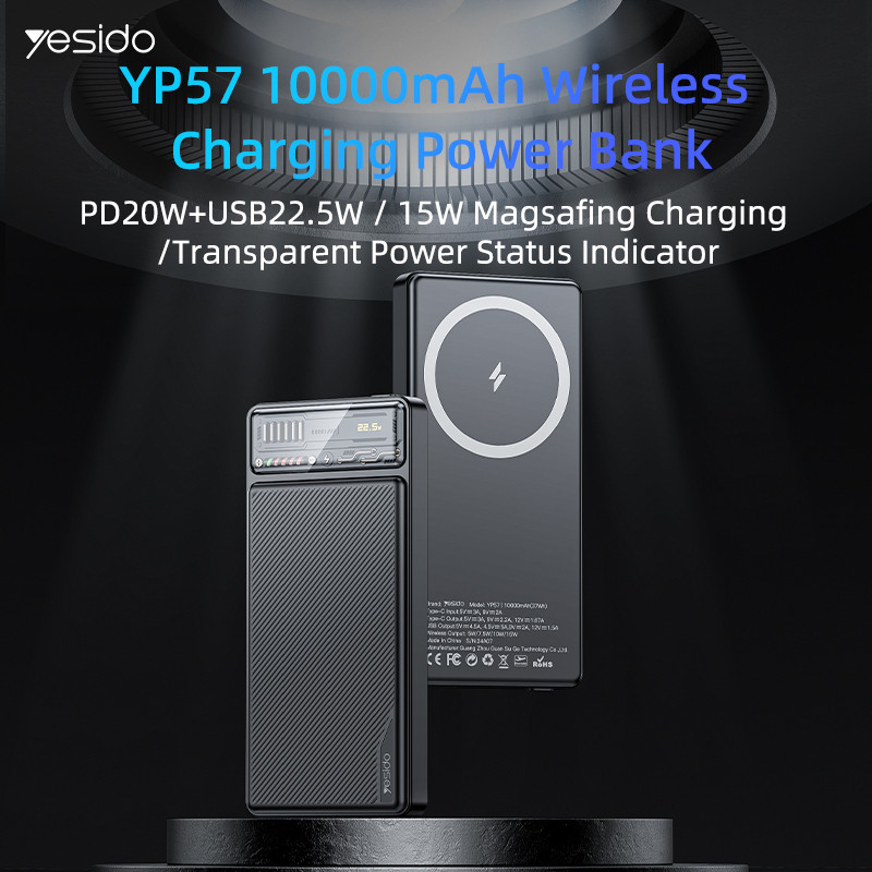 شارژر همراه یسیدو مدل YP57 با ظرفیت 10000 میلی آمپر ساعت محصولی از کارخانه یسیدو است. این محصول مجهز به سه عدد خروجی شامل یک عدد درگاه تایپ سی (مشترک)، یک عدد پورت USB و یک عدد پد شارژ وایرلس مناسب آیفون سری 12 الی 15 است.این پاوربانک مجهز به پشتیبانی از شارژ سریع QC3.0 و فناوری PD، درگاه USB دارای حداکثر توان خروجی 22.5 وات و درگاه Type-C دارای حداکثر توان 20 وات است.توان خروجی پد وایرلس معادل با 5، 7.5، 10 و 15 وات، جریان خروجی در صورت استفاده همزمان معادل 3 آمپر در 5 ولت است.بدنه ساخته شده از جنس پلاستیک ABS، امکان روشن و خاموش کردن پاوربانک توسط کلید فیزیکی روی بدنه است. دارای نمایشگر و نشانگر LED است.