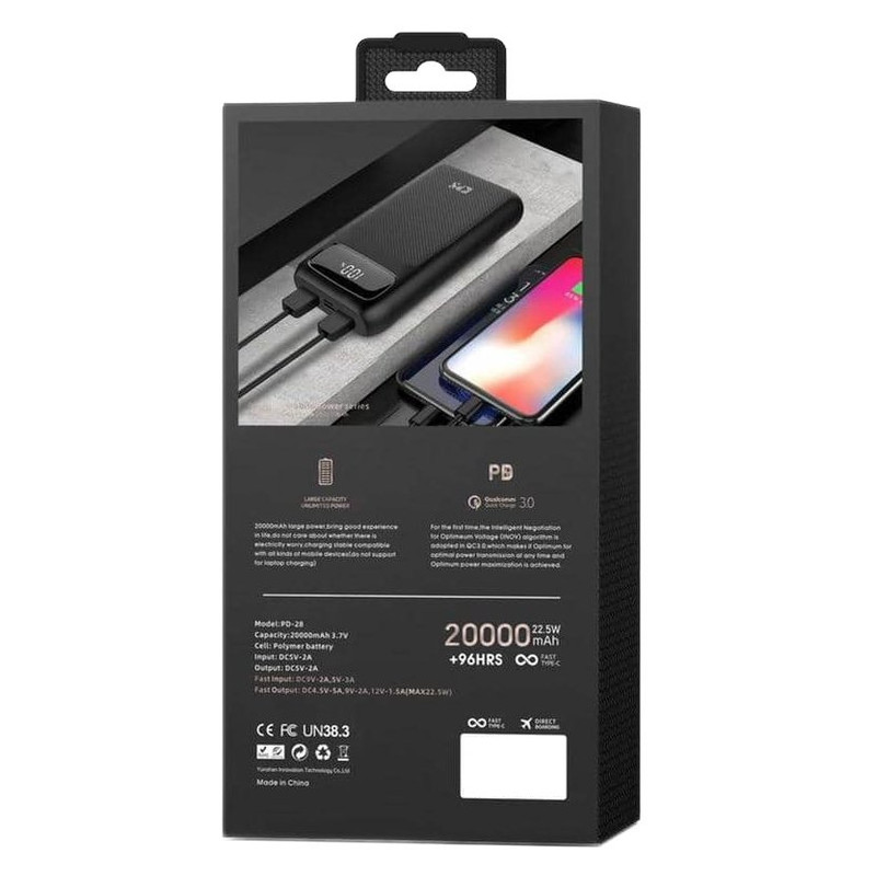 مشخصات فنی۲۰۰۰۰ میلی آمپر ۶۶ وات - نشانگر درصد باتری - ۲ پورت ورودی و خروجی USB - پورت ورودی MICRO USB - پورت خروجی Type-c - پشتیبانی از فناوری شارژ سریع Power Delivery (PD)