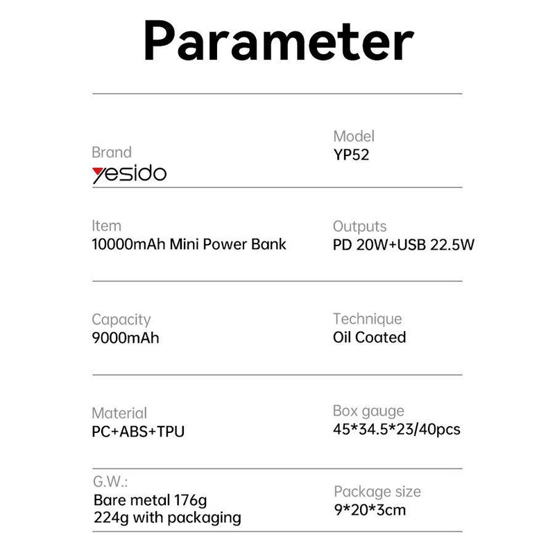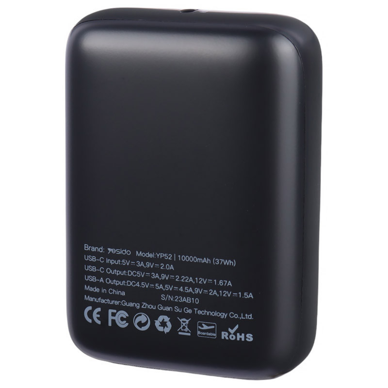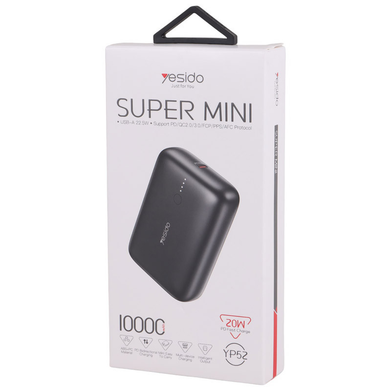شارژر همراه فست شارژ یسیدو سری سوپر مینی مدل YP52 با ظرفیت 10000 میلی آمپر ساعت محصولی از کارخانه یسیدو است. حداکثر جریان خروجی 5 آمپر در 4.5 ولت، پشتیبانی از فناوری های PD و QC3.0 با حداکثر توان خروجی برابر با 22.5 وات است.مجهز به کلید فیزیکی جهت خاموش/ روشن کردن پاور بانک و نشانگر LED، امکان شارژ مجدد توسط درگاه Type-C و کابل همراه است.مجهز به 2 درگاه خروجی شامل یک عدد USB و یک عدد Type-C (مشترک)، تامین انرژی از طریق باتری داخلی با ظرفیت 10000 میلی آمپر ساعت است.