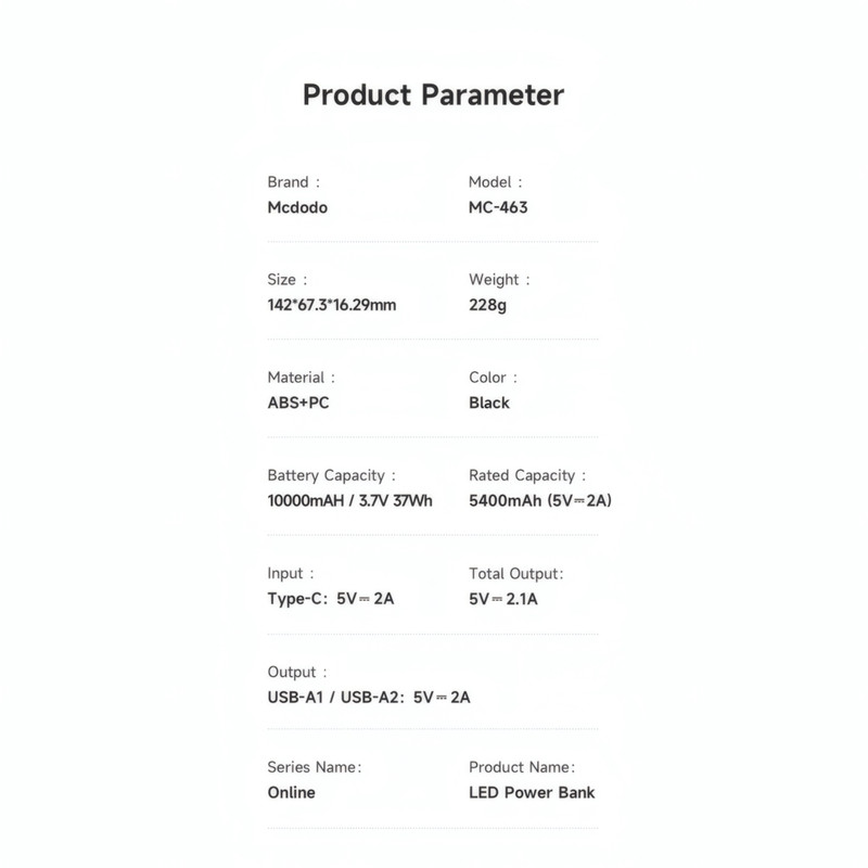پاوربانک مک دودو مدل MC-463 LED Version با ظرفیت 10000 میلیآمپرساعت، یک شاهکار باریک و کارآمد که انرژی دستگاههای شما را با ایمنی و کارایی بیمانند تأمین میکند. این پاوربانک با بدنهای از پلیکربنات نسوز (PC) و پلاستیک ABS، در ابعاد 142×16.3×67.3 میلیمتر و وزن سبک 228 گرم، طراحی شیک و مینیمالیستی دارد. فوقالعاده باریک و سبک، بهراحتی در جیب یا کیف جای میگیرد و همراهی ایدهآل برای سفر، کمپینگ یا مواقع اضطراری است. MC-463 با ظرفیت اسمی 10000 میلیآمپرساعت (3.7V، 37Wh) و ظرفیت واقعی 5400 میلیآمپرساعت (5V/2A)، توان خروجی 10.5 وات را ارائه میدهد. مجهز به دو پورت خروجی USB-A (5V/2A) و یک پورت ورودی Type-C (5V/2A)، امکان شارژ همزمان دو دستگاه را فراهم میکند، با کل خروجی 5V/2.1A. باتری لیتیوم پلیمر آن، شارژ ایمن و پایداری را تضمین میکند. تراشه هوشمند داخلی با مدار حفاظت چندگانه (حفاظت در برابر تخلیه بیشازحد، اتصال کوتاه، شارژ بیشازحد و کشش کم)، جریان و ولتاژ مناسب هر دستگاه را بهصورت خودکار تنظیم میکند و ایمنی کامل را فراهم میآورد. برای اطمینان از اصالت و کیفیت محصول، توصیه میکنیم که فقط از فروشندگان معتبر مانند تکنیک تل که سابقه درخشانی در ارائه محصولات باکیفیت دارند خرید کنید. متاسفانه، برخی فروشندگان با قیمتهای پایینتر محصولات های کپی را به بازار عرضه میکنند که کیفیت ضعیفی دارند و میتوانند تجربه شما را تحت الشعاع قرار دهند. صفحهنمایش LED با چهار چراغ آبی، میزان شارژ باقیمانده را بهصورت دقیق نمایش میدهد و مدیریت شارژ را آسانتر میکند. این پاوربانک با کابل 20 سانتیمتری Type-C (3A) همراه است و برای شارژ گوشیهای هوشمند، تبلتها و دیگر دستگاهها ایدهآل است. اگر به دنبال پاوربانکی هستید که طراحی شیک، شارژ ایمن و قابلیت حمل آسان را در کنار هم ارائه دهد، MC-463 انتخابی است که تجربه انرژیرسانی شما را متحول میکند؛ محصولی که کیفیت، کارایی و نوآوری برند مک دودو را با قدرت هرچه تمامتر به نمایش میگذارد و هر کاربری را با عملکرد، ظرافت و دوامش شگفتزده میکند.