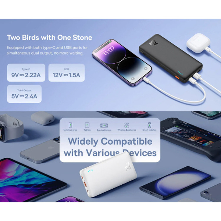 این پاور بانک با ظرفیت باتری 10000 میلی آمپر ساعت دارای دو عدد درگاه خروجی بوده که شامل یک عدد پورت USB و یک عدد پورت Type-C می باشد و شما قادر خواهید بود دو دستگاه را به طور همزمان شارژ نمایید؛ در نظر داشته باشید در صورت استفاده همزمان از پورت ها، این توان بین دو پورت تقسیم خواهد شد!