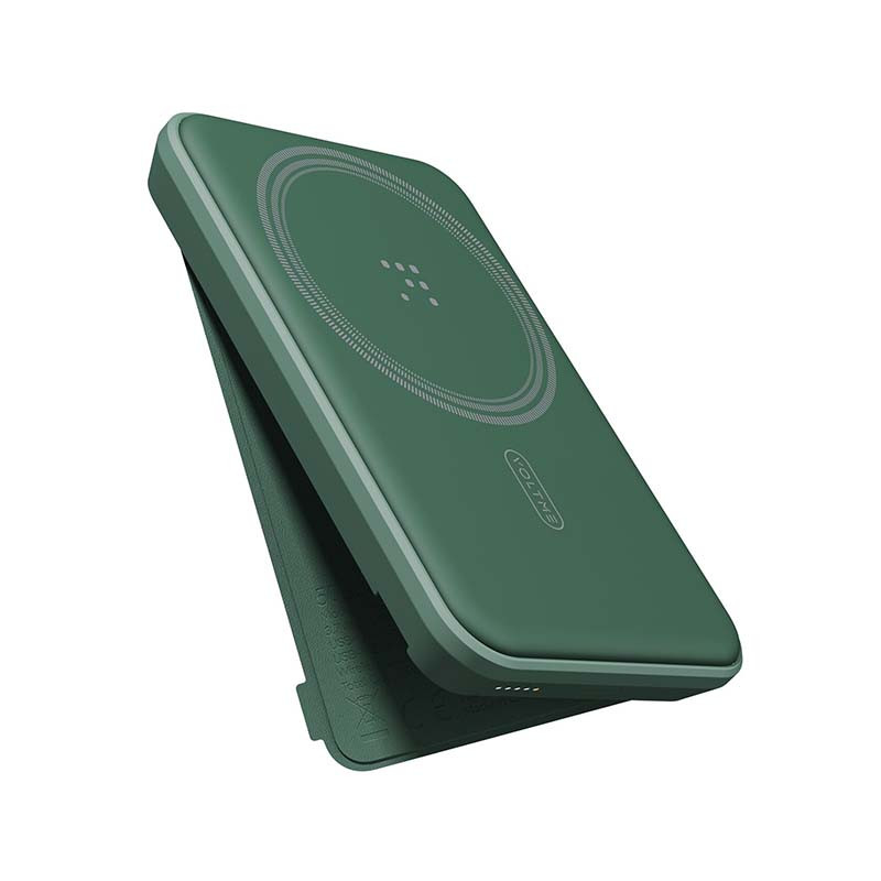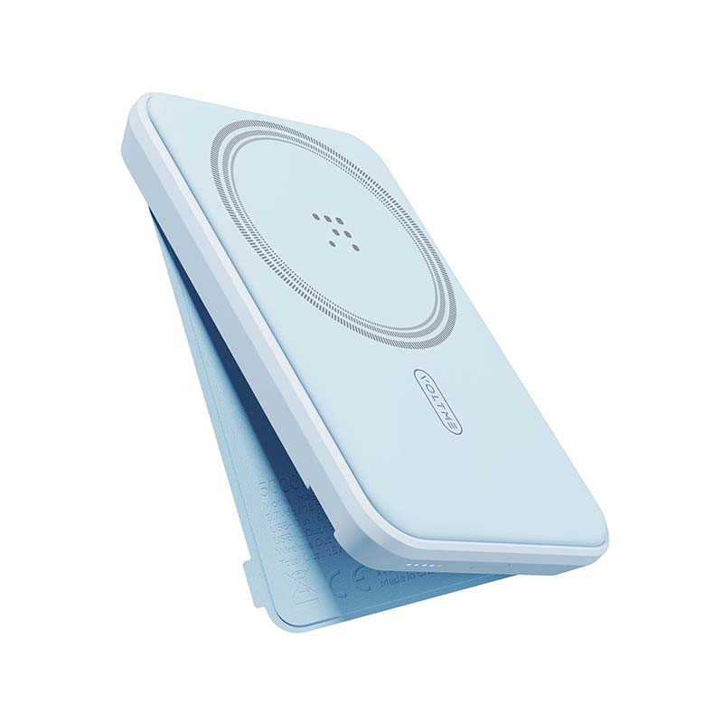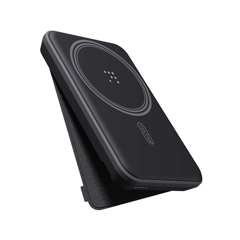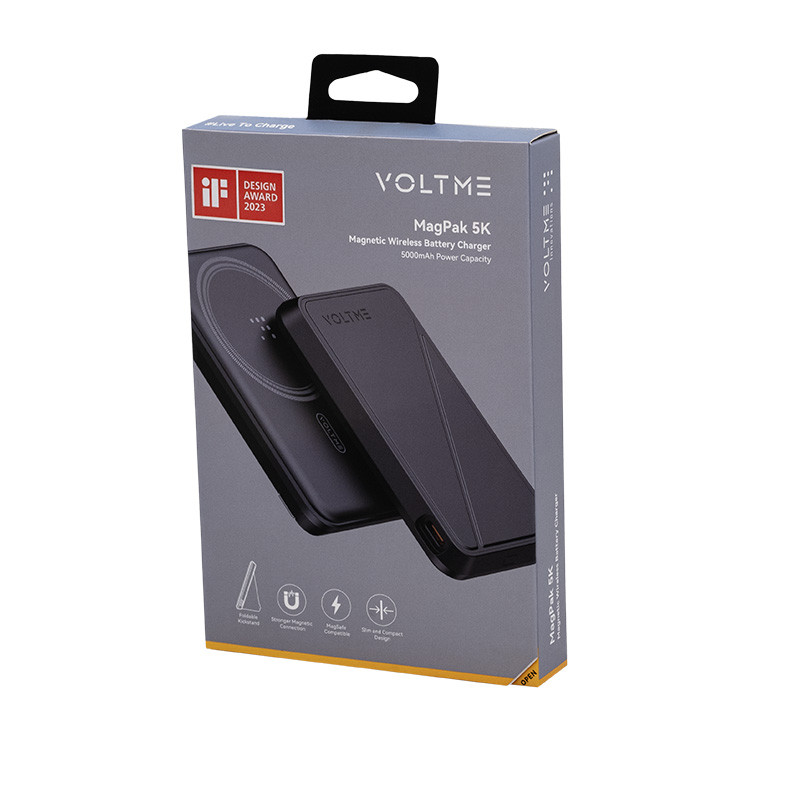 پاوربانکهای برند نوآور ولتمی در بازار مصرف کنندهِ ی کل دنیا شناخته شده و محبوب است. این برند یک پاوربانک با نام MagPak 5k Magnetic Wireless دارد و همانطور که از نامش مشخص است حالت شارژ مگنتی را برای گوشی هایی که از این قابلیت پشتیبانی می کنند را مهیا کرده است. ظرفیت باتری آن ۵۰۰۰ میلیآمپر ساعت با استفاده از باتریهای سیلیکون آنود Amprius ساخت آمریکا (نسبت به باتریهای لیتیوم-یونی معمولی عملکرد بهتری دارد) است. امکان شارژ همزمان دو دستگاه یکی بهصورت بیسیم و دیگری از طریق کابل با اولویتدهی به دستگاه متصل وجود دارد. خروجی بیسیم این مگسیف با پشتیبانی از شارژ بیسیم Qi با توان ۷.۵ وات، سازگار با فناوری MagSafe اپل است. خروجی سیمی در پورت USB-C با توان خروجی ۱۵ وات (5V/3A) برای شارژ سریعتر از طریق کابل در این پاوربانک مهیا میباشد. جنس و کیفیت ساخت بدنه این پاوربانک مگسیف از جنسی سخت و مقاوم ساخته شده است. همچنین سبک وزن بودن(134 گرم)، از دیگر ویژگی های ظاهری Voltme MagPack به حساب می رود. در پشت این محصول یک لبه جداشونده وجود دارد که بهراحتی از بدنه اصلی پاوربانک جدا میشود و در هنگام شارژ بهصورت ایستاده و ثابت (در دو حالت عمودی و افقی) قرار میگیرد. این پاوربانک مجهز به آهنرباهای قدرتمند با نیروی ۹ نیوتن(9N=900g) است که اتصال محکم و ایمنی به پشت آیفون فراهم میکند. این ویژگی باعث میشود که در هنگام استفاده، دستگاه بهراحتی جدا نشود و تجربه شارژ بیسیم بدون دردسر را فراهم کند.
