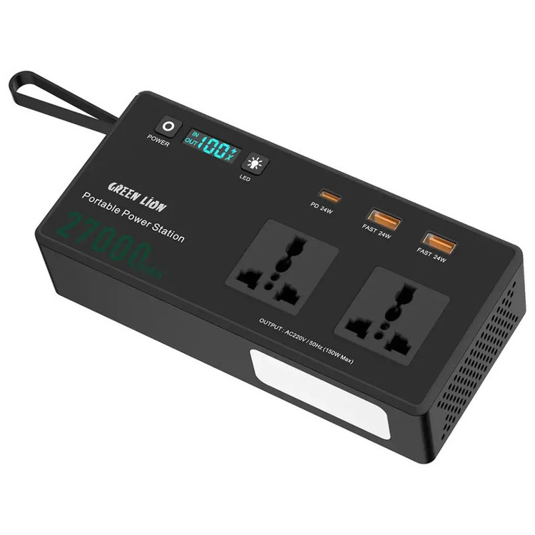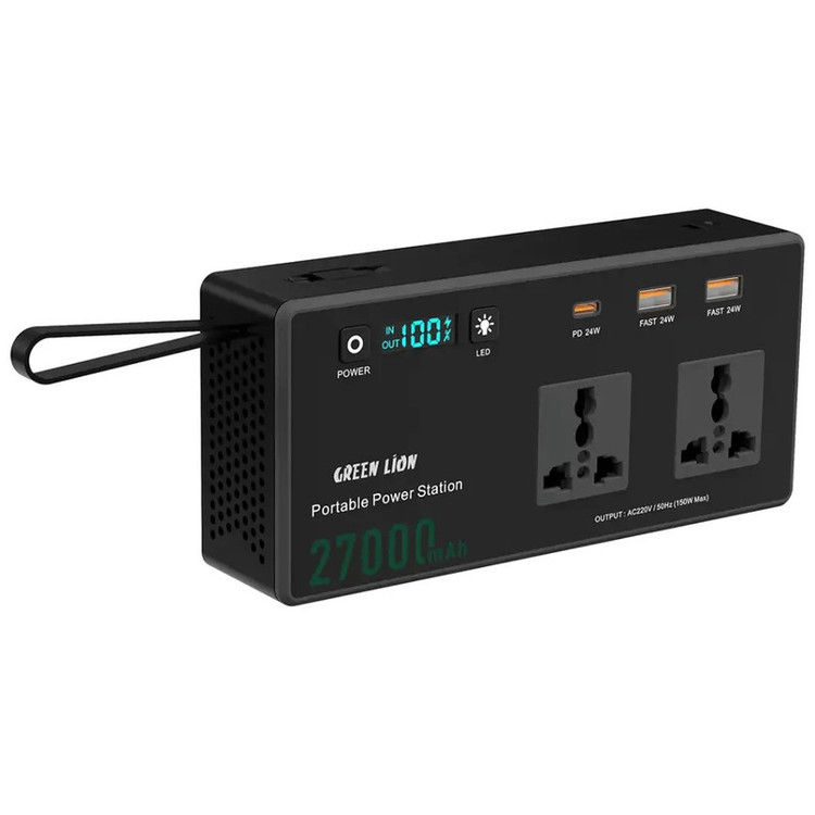 پاوربانک Green Lion Volt Mate 27000mAh یک پاوربانک بسیار همهکاره است که انواع نیازهای شارژ را برآورده میکند. این پاوربانک با ظرفیت نامی ۲۷۰۰۰ میلیآمپر ساعت (۹۷.۲ وات ساعت)، منبع تغذیهای نسبتاً پایدار برای دستگاههای در حال حرکت است. این پاوربانک دارای خروجیهای متعددی مانند USB-C (PD 60W)، USB-A (QC 24W) و خروجی AC (150W، ۲۲۰ ولت ~ ۵۰ هرتز) است تا به شما امکان دهد دستگاههای اصلی خود را از طریق آن شارژ کنید. ورودی/خروجی USB-C میتواند از ولتاژهای مختلف (۵ ولت تا ۲۰ ولت) برای شارژ سریع و کارآمد پشتیبانی کند. دو نوع چراغ قوه (LED و SOS) به همراه یک فن خنککننده و یک صفحه نمایش دیجیتال که وضعیت فعلی را نشان میدهد، در داخل آن تعبیه شده است. کارهای زیادی برای راحتی و ایمنی شما انجام شده است. این پاوربانک همچنین دارای ویژگیهای محافظتی فراوان و یک بند حمل است که قابلیت حمل را افزایش میدهد. یک منبع قابل اعتماد و قدرتمند در مواقع ضروری، مانند ماجراجوییهای فضای باز، موارد اضطراری یا حتی در زندگی روزمره، در کنار شما است.