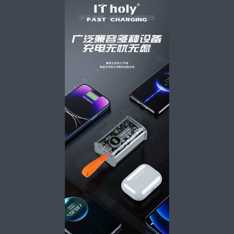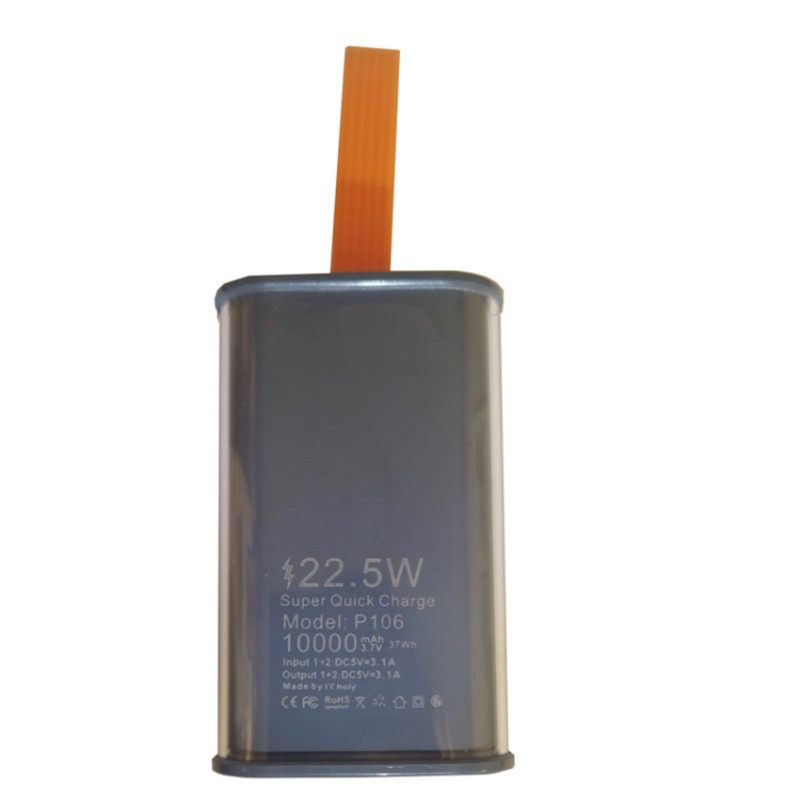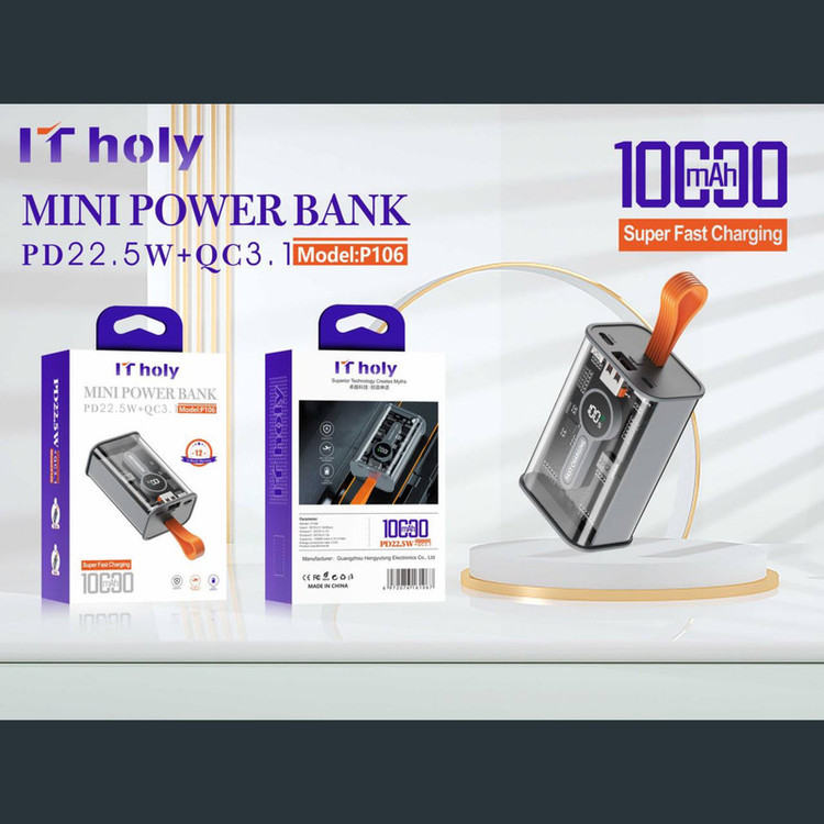 پاور بانک P106 از سری پاور بانک های پرقدرت و فست شارژ برند IT holy با توان خروجی 22.5W (وات) می باشد . ظرفیت این پاور بانک 10000mAh (میلی آمپر ساعت) است و سایز مناسب آن باعث شده جا به جایی و حمل راحت تری نسبت به سایر برند ها داشته باشد . پاور بانک IT holy P106 گوشی و تبلت شما را در سریع ترین حالت ممکن شارژ می کند و درصد شارژ پاور بانک روی LED که روی پاور بانک تعبیه شده نشان داده می شود . این پاور بانک از دو خروجی ، یکی USB-A با قابلیت QC 3.1 و دیگری USB-C با قابلیت PD که هر دو شدت جریان 3.1A (آمپر) ولتاژ 5V (ولت) را از خود خارج می کند ، بهره می برد . همچنین پاور بانک P106 دارای ورودی های micro و USB-C می باشد . پاور بانک IT holy مدل P106 سازگاری، مقرون به صرفه، در هر زمان و هر مکان برای شارژ دستگاه شما دارد . این پاور بانک بسیار بادوام برای استفاده می باشد . عالی، ایمن و کاربردی است، به خصوص زمانی که در سفر هستید . بسیار فوق العاده ، سازگار با بیش از 99٪ تلفن های همراه، رایانه های لوحی، بلوتوث بلندگوها و سایر محصولات دیجیتال و بسیار راحت و محافظ محیط زیست است .