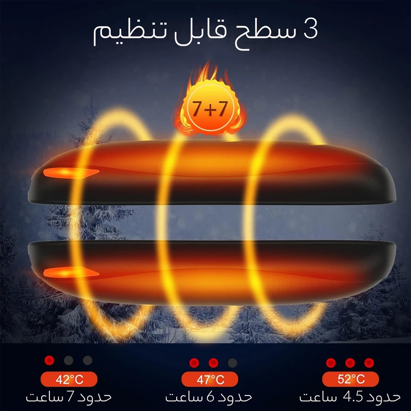 3 تنظیم حرارتی مختلف: 3 تنظیم دما 40 ~ 45 (کم) / 45 ~ 50 (متوسط) / 50 ~ 55 درجه سانتیگراد (بالا) وجود دارد تا با انتخاب متفاوت شما مطابقت داشته باشد، دستان شما 4-7 گرم شوند. ساعت در هر بسته پس از شارژ کامل.