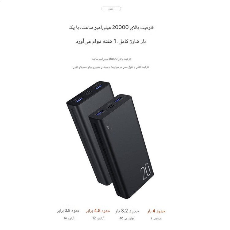 پورت PD با توان 20 وات و خروجی USB با توان 22.5 وات (Super Fast Charge) امکان شارژ سریع انواع گوشیهای هوشمند، تبلتها و سایر گجتها را فراهم میآورد. باتری این محصول از نوع لیتیومپلیمر است که علاوه بر وزن کمتر، دوام بالاتری نسبت به باتریهای معمولی دارد.
