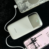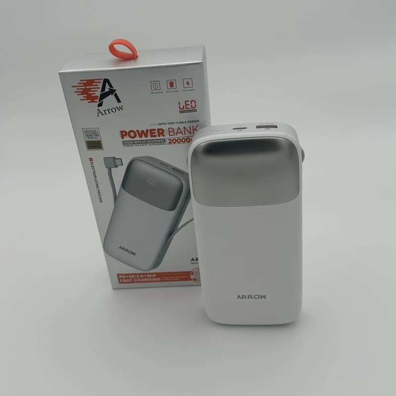 مشخصات فنی : ظرفیت 20000 mAh دارای دو کابل متصل تایپ c و لایتنیگ متصل به بدنه درگاه خروجی تایپ A درگاه ورودی تایپ C نمایشگر LED PD,QC3.0