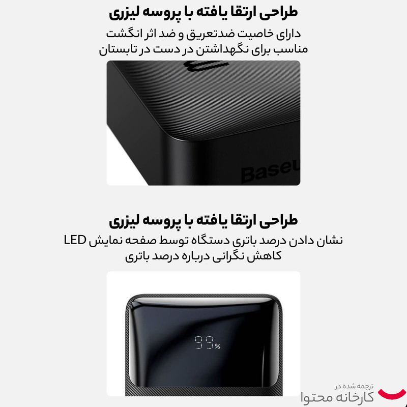 Baseus فناوری Power Delivery و چیپست هوشمندی را نیز برای عملیات شارژ ایمن در پاور بانک فست شارژ PPDML-L فراهم کرده که با تشخیص و متناسب سازی شدت جریان موردنیاز دستگاه های متصل شده از باتری آنها در برابر بار اضافی، نوسانات ولتاژی، اتصالات کوتاه و … محافظت خواهد کرد. یکی دیگر از قابلیت های کاربردی این شارژر همراه، پشتیبانی از فناوری NTC می باشد که با بررسی و تنظیم میزان دما و حرارت تولیدی متناسب در زمان استفاده، از آسیب دستگاه ها در برابر گرمای بیش از حد جلوگیری می کند. نمایشگر LED جهت اطلاع وضعیت شارژ باتری به صورت درصدی و یک کلید فیزیکی به منظور روشن و خاموش کردن دستگاه نیز بر روی بدنه این ابزار جانبی وجود دارد.