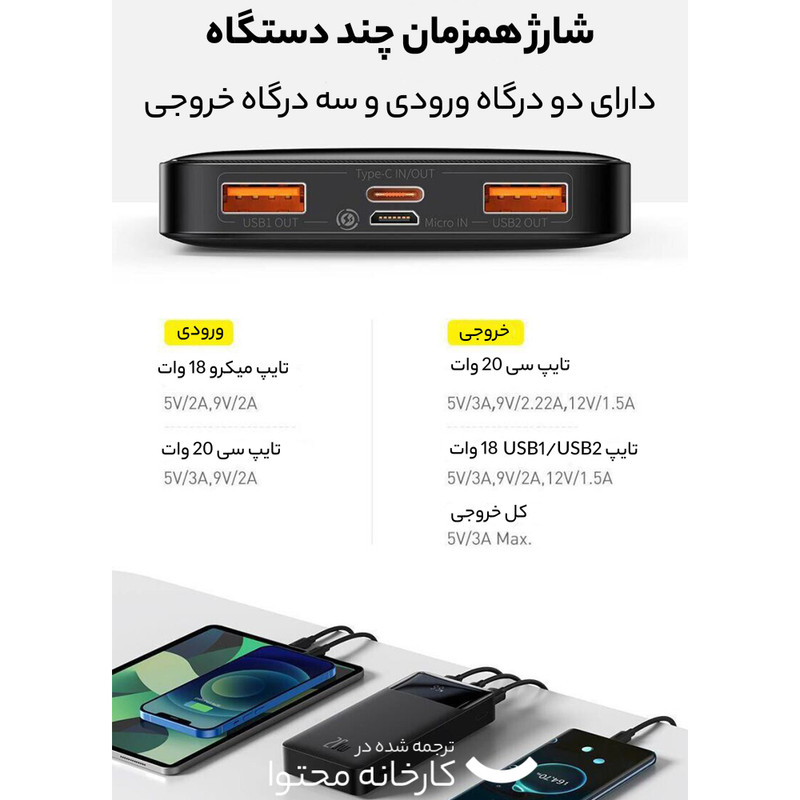 + موارد بیشترپاوربانک مدل PPDML-L محصولی از برند معتبر باسئوس می باشد که از بدنه ای به جنس پلاستیک ABS و پلی کربنات ضد حرارت مقام در برابر ضربه، فشار و … ساخته شده است. دو پورت خروجی USB و یک درگاه خروجی مشترک Type-C به منظور شارژ گوشی های موبایل و دیگر گجت های هوشمند با حداکثر شدت جریان عبوری 3 آمپر در 5 ولت بر روی بدنه این دستگاه وجود دارد. این شارژر همراه با بهره مندی از توان کلی 20 وات و باتری لیتیوم پلیمری به ظرفیت 10000 میلی آمپر ساعت، می تواند سه دستگاه مختلف را به صورت همزمان با پشتیبانی از فناوری شارژ سریع در مدت زمان کوتاه و به شکل مطمئن شارژ نماید. همچنین جهت شارژ خود پاوربانک، یک درگاه ورودی MicroUSB با حداکثر شدت جریان 2 آمپر در 5 ولت و یک پورت مشترک ورودی / خروجی Type-C با حداکثر شدت جریان 3 آمپر در 5 ولت درنظر گرفته شده است.