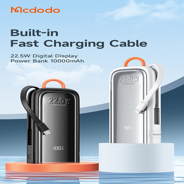 پاوربانک مک دودو مدل Mcdodo MC-116 این امکان را برای شما فراهم میسازد که به طور همزمان 3 دستگاه مختلف را شارژ کنید. دو کابل از نوع Type-C برای گوشیهای اندرویدی و Lightning برای گوشیهای آیفون به پاوربانک متصل شده و علاوه بر آن، یک پورت Type-C و یک پورت Type-A نیز وجود دارد. این پاوربانک قابلیت شارژ سریع را نیز داراست که به لطف توان خروجی 22.5 واتی، شارژ به صورت همگام و موازی صورت میگیرد و فشاری هم بر روی باتری دستگاهها وارد نمیشود.