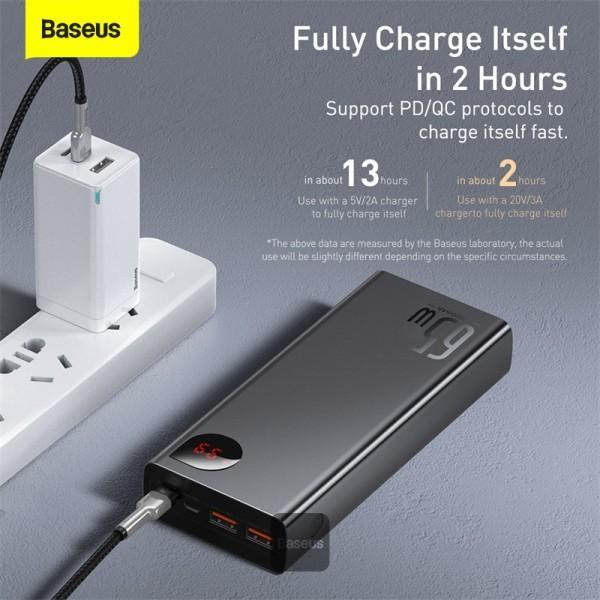 شارژر همراه باسئوس مدل PPIMDA-D03 ظرفیت 20000 میلی آمپر ساعت تنها 450 گرم وزن دارند و به راحتی قابل حمل است. این محصول دارای باتری پلیمری با ظرفیتی معادل 20 هزار میلیآمپرساعت است و میتواند چندینبار (با توجه به ظرفیت باتری محصول مورد نظر) دستگاه شما را شارژ کند. این محصول دارای فناوریهای محافظتی برای کنترل شدت جریان و ولتاژ است . بدنه این دستگاه بسیار مقاوم است و در اثر ضربه به آسانی صدمهای نمیبیند. قابل ذکر است که این پاوربانک توانی معادل 65 وات دارد و توانایی شارژ سریع کردن 3 دستگاه را بهصورت همزمان دارد. شما برای شارژ پاوربانک باسئوس PPIMDA-D03 به 4 الی 6 ساعت زمان نیاز خواهید داشت.دو پورت خروجی USB روی این پاوربانک هر دو از استاندارد فست شارژ بهره میبرند و میتوانند گوشی شما را را با سرعت بالا شارژ کنند. پورت تایپ سی نیز از فناوری PD برخوردار شده و این یعنی قادر است دستگاههایی غیر از گوشی موبایل که دارای توان برابر و کمتر از 65 وات هستند را هم شارژ کند. بدین ترتیب شما میتوانید مک بوکتان را هم به این پاوربانک وصل کنید تا در عرض 2 ساعت شارژ شود.شما میتوانید خود پاوربانک را هم با توان 20V/3A در عرض 4 ساعت شارژ کنید.به طور کلی پاوربانک فست شارژ 20000 میلی آمپر PPIMDA-D03 از فناوریهای شارژ سریع QC ،PD و SCP پشتیبانی میکند.ابعاد این محصول 27×65×154 میلی متر می باشد.نحوه تقسیم توان شارژ میان پورتهای USB و تایپ سی در تصاویر موجود است و امکان شارژ 3 دستگاه همزمان وجود دارد.