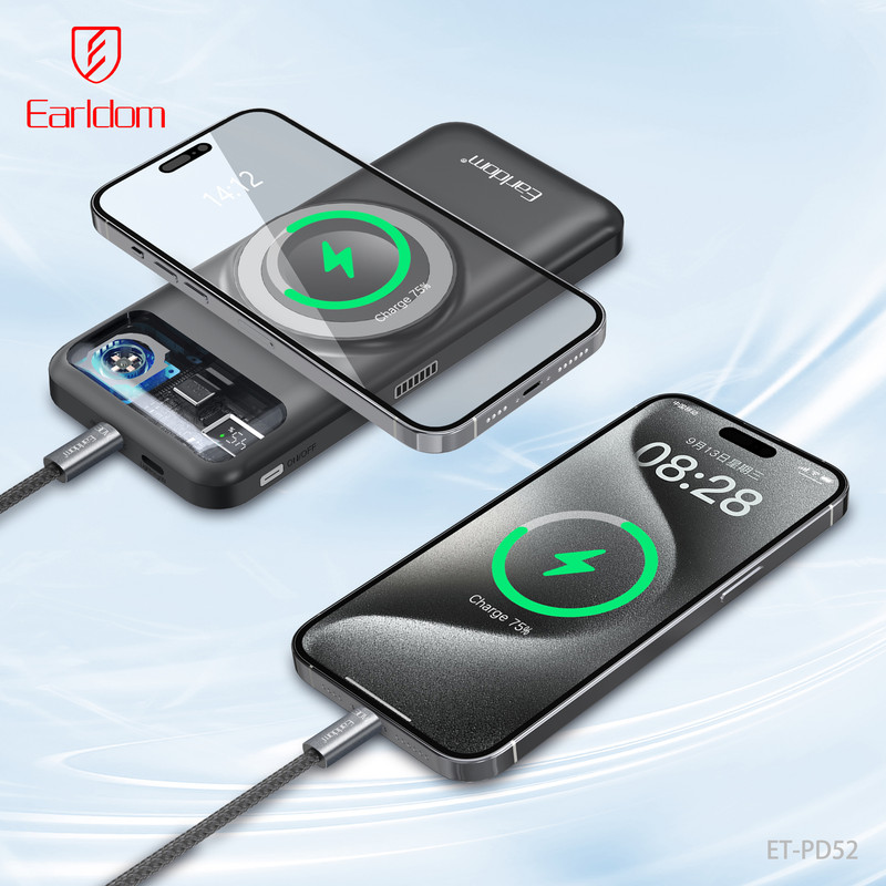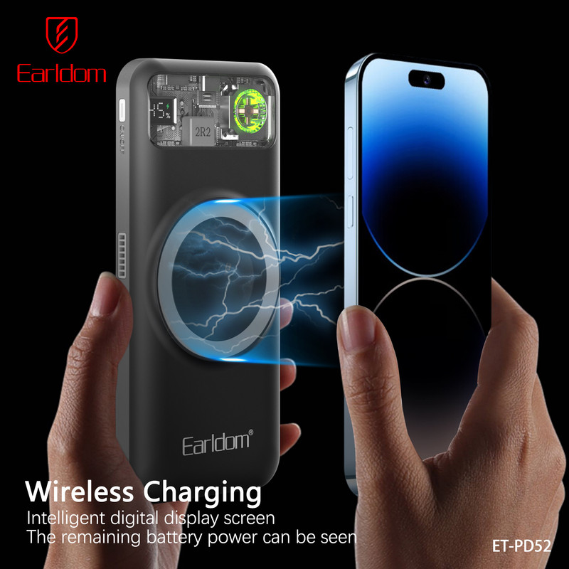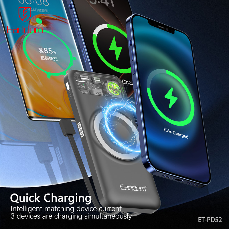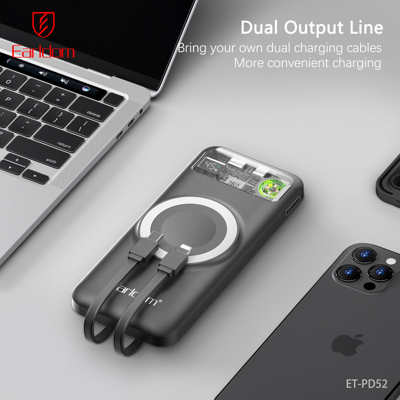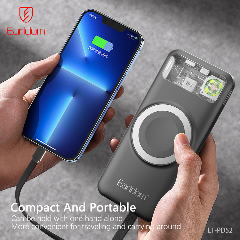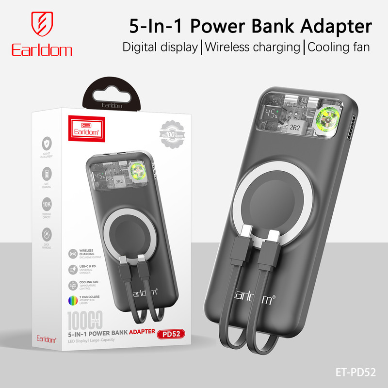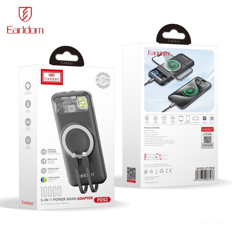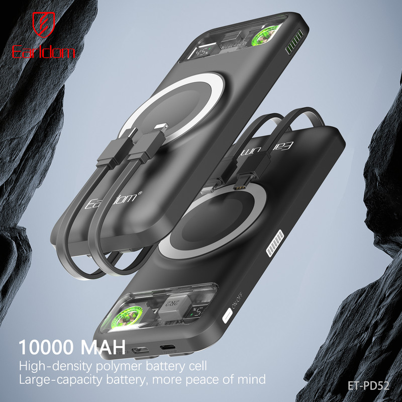 پاوربانک ارلدام مدل PD52 یک پاوربانک پنجکاره (5in1) با ظرفیت 10000 میلیآمپر ساعت است که امکانات متنوع و طراحی منحصربهفردی را در اختیار شما قرار میدهد. این پاوربانک از باتری پلیمری باکیفیت و بدنه مقاوم PC+ABS ضدحریق ساخته شده و علاوه بر شارژ سریع، ایمنی بالایی نیز دارد. شارژ بیسیم 15 واتی آن علاوه بر گوشیهای موبایل، امکان شارژ ساعت هوشمند را هم فراهم میکند و دو کابل سرخود تایپسی و لایتنینگ باعث میشود همیشه بدون نیاز به کابل جداگانه بتوانید دستگاههای مختلف را شارژ کنید.