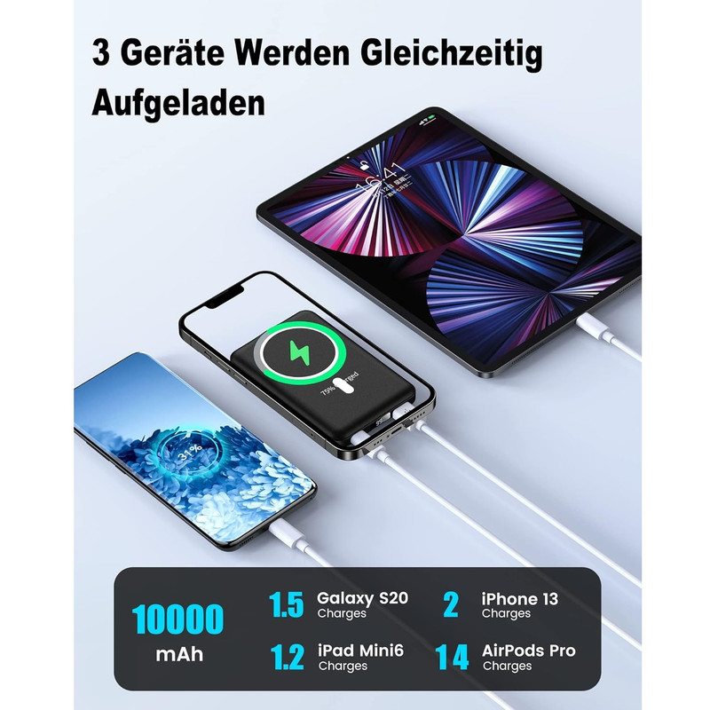 امکانات و قابلیتها3 دستگاه را همزمان شارژ کنید :مجهز به 3 خروجی شارژ بی سیم مغناطیسی 5W/7.5W/15W، 20W PD USB-C/Type-C و 22.5W QC USB-A.