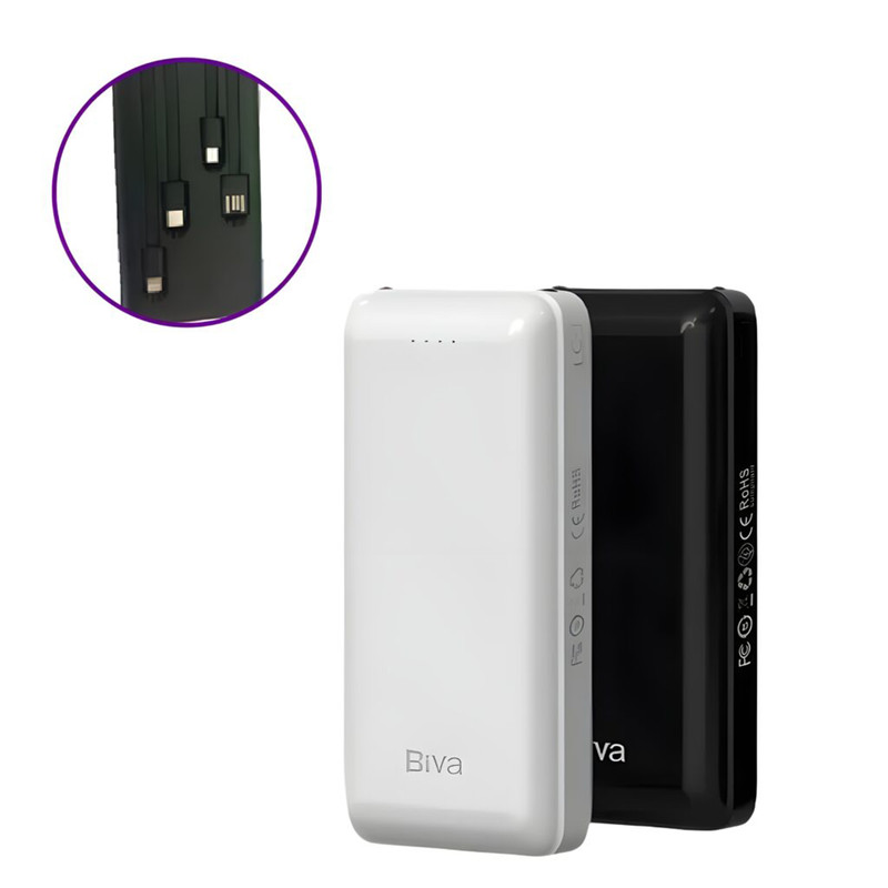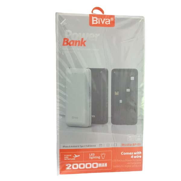 پاور بانک بیوا مدلBP-05به همراه 3 کابلTYPE-C و لایتنینگ و اندروید ...) متصل به بدنه شما رو بی نیاز از کابل میکنه، علاوه بر کابل های متصل به پاور در این محصول یک درگاه خروجی در نظر گرفته شده است که شدت جریان خروجی در آن 2 آمپر است و دیگری Type-C است و میتوانید با شارژر مناسب ترجیحاً 3 آمپر و بیشتر این پاوربانک را شارژر کنید و یا حتی توسط کابل تایپ سی از این درگاه گوشی خودرا شارژ کنید. این محصول با انواع گجتهای هوشمند مثل دوربین، تبلت، گوشی سازگار است. بر روی بدنه پاوربانک نشانگرهای LED میزان شارژ تعبیه شده است که با نمایش وضعیت شارژ نشان می دهد.میزان ولتاژ ورودی و خروجی در آن 5-9و12 ولت متغییر است که متناسب با شارژر شما به صورت اتماتیک تعیین میشود.همچنین این محصول با بهره گرفتن از پردازنده ساخت اکو به صورت هوشمند در برابر افزایش ولتاژ، دما و جریان محافظت شده است.
