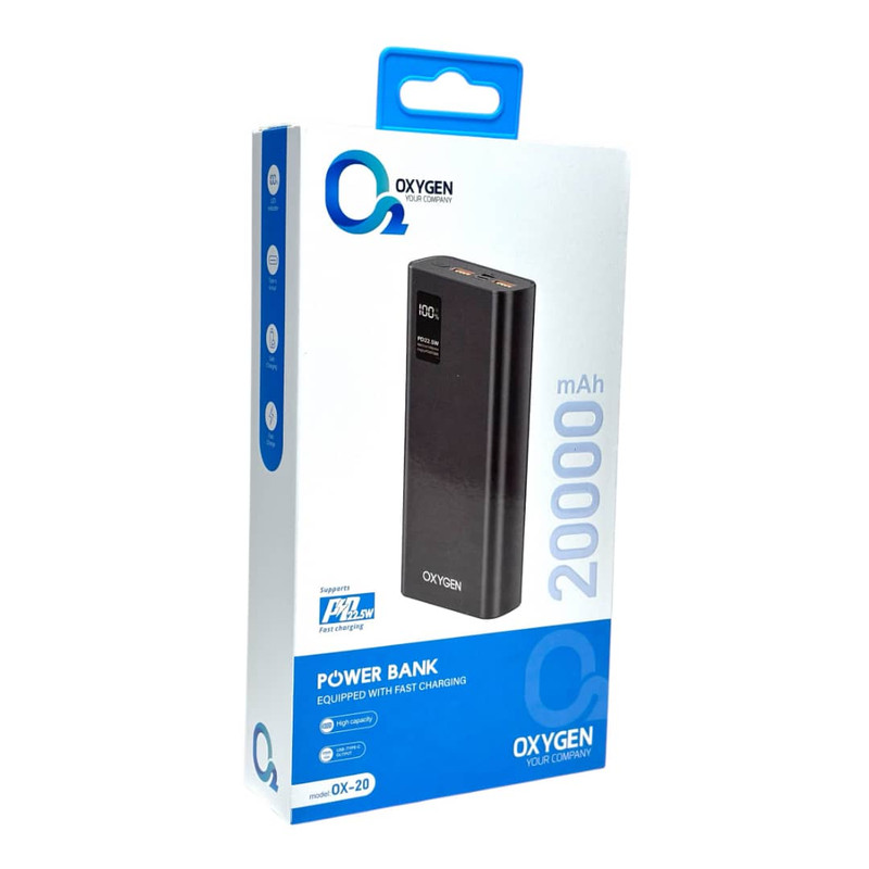 سازگار باسازگار با پاوربانک Oxygen مدل OX‑20 (Fast Charge PD 22.5W، ظرفیت ۲۰۰۰۰ میلیآمپرساعت)، یک پاوربانک پرظرفیت با قابلیت شارژ سریع USB Power Delivery است که تقریباً با هر دستگاه USB سازگار است