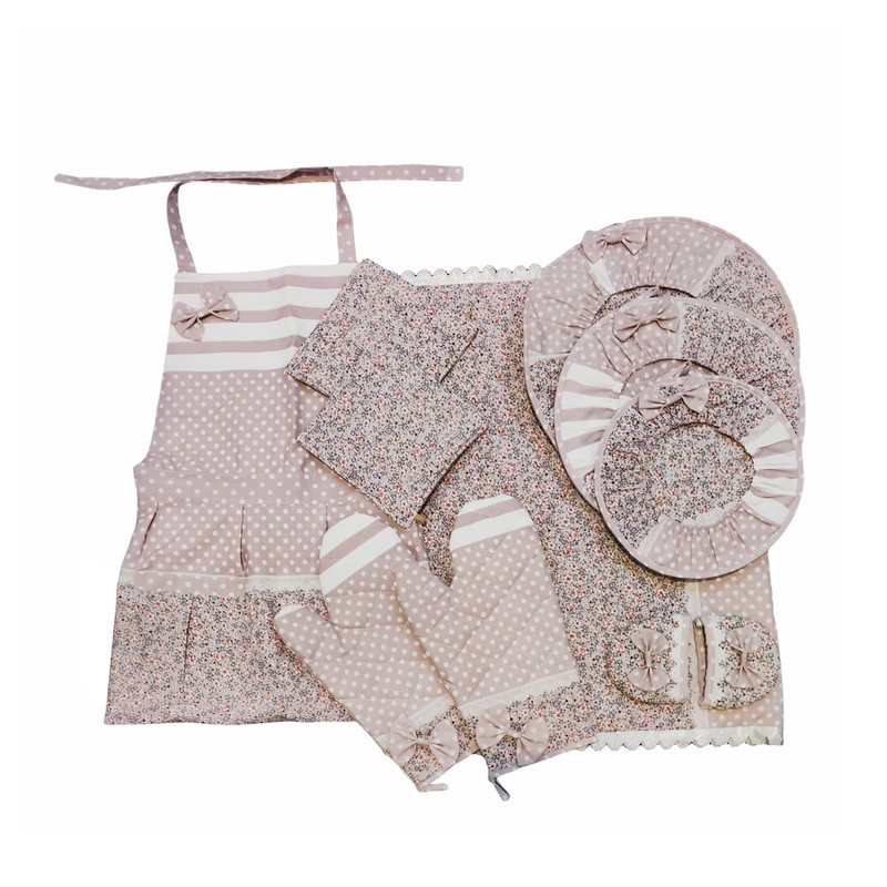 شاملسه عدد دمکنی , یک جفت دستکش فر , یک عدد پیشبند , آبگیر کنار سینک , دو عدد دستگیره قابلمه , دو عدد دستگیره