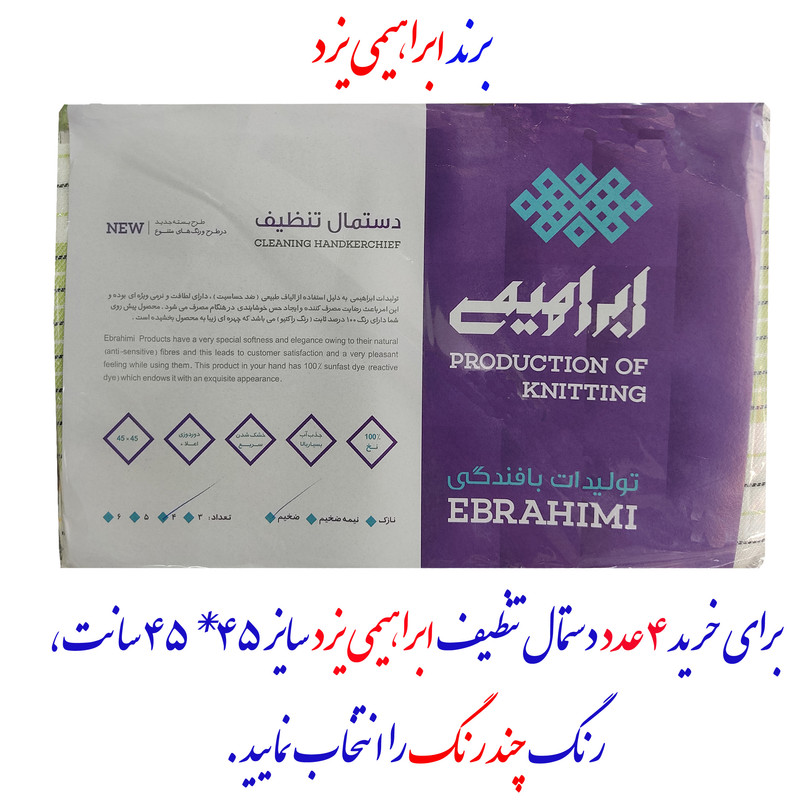 سایر توضیحات: دستمال تنظیف نخی تولید شده با 100 درصد الیاف طبیعی ویسکوز در بسته های 4 عددی با ابعاد تقریبی 45 در 45 سانتیمتر بدون پرز دهی و با آبگیری باورنکردنی و 100 درصد رنگ ثابت با کاربردهای بسیار متنوع از دستمال تنظیف گرفته تا حوله جیبی.