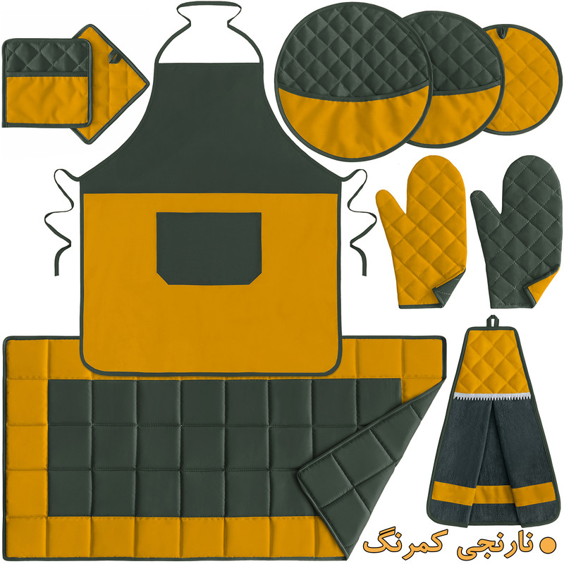 سرویس آشپزخانه 10 پارچه راولا سری N از پارچه ترگال مرغوب و زیبا با رنگ ثابت تولید شده و سعی شده است با دقت در دوخت، ضخامت زیاد الیاف پلی استر و بسته بندی شکیل و زیبا محصولی بسیار با کیفیت و درخور هموطنان به شما عزیزان ارائه شود. این سرویس آشپزخانه شامل 1 عدد پیشبند جیب دار دو لایه با یک لایه پارچه و یک لایه نایلون ضد آب، 3 عدد دمکنی با قطرهای 24، 29 و 34 سانتیمتر و پر شده با الیاف پلی استر، 1 جفت دستکش فر با پوشش ساق دست و 1 جفت دستگیره آشپزخانه ضخیم و پر شده با الیاف پلی استر، 1 عدد حوله بدون پرز با جذب آب زیاد و 1 عدد آبگیر دو رو و قابل استفاده از هر دو طرف با ابعاد بزرگ 86x44 سانتیمتر با رطوبت گیری و جذب آب عالی برای ظروف و میوه می باشد.