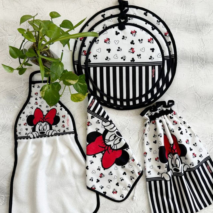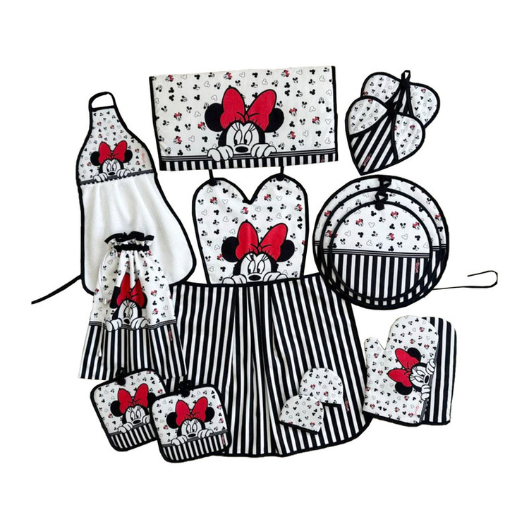 شامل: سه عدد دمکنی , یک جفت دستکش فر , یک عدد کیسه سبزی , یک عدد پیشبند , یک عدد حوله آشپزخانه , دو عدد دستگیره تاوه , آبگیر کنار سینک , دو عدد دستگیره قابلمه , دو عدد دستگیره