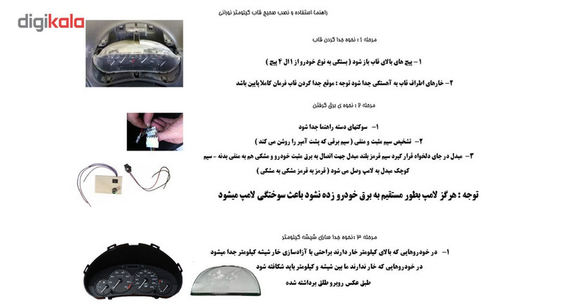 قاب کیلومتر نورانی (جدید - خاص ).... قاب کیلومتر نورانی دارای پلکسی های رنگی است که در ترکیب ساخت قاب کیلومتر بکار رفته و با لامپ اس ام دی مخصوص که مقابل قاب نصب میشود و با روشن شدن لامپ بر اثر تابش مستقیم به قاب، پلکسی های رنگی نورانی شده و زیبایی خاصی پیدا می کند . لامپ قاب کیلومتر بوسیله مداری که در عکس مشاهده می کنید قابل خاموش، روشن، کم و یا زیاد شدن نور است. این قابها جدید و بسیار پر طرف دار بوده. طریقه نصب و راهنما در جعبه محصول موجود است.توجه : ملاک رنگ ... رنگ صورتی : پلکسی رنگی قرمز قسمت رویی قاب و پلکسی رنگی ابی قسمت پایین قاب به سمت آمپر میباشد. رنگ سبز در این مدل : پلکسی رنگ قرمز قسمت رویی قاب و پلکسی رنگی سبز قسمت پایین قاب به سمت آمپر میباشد .