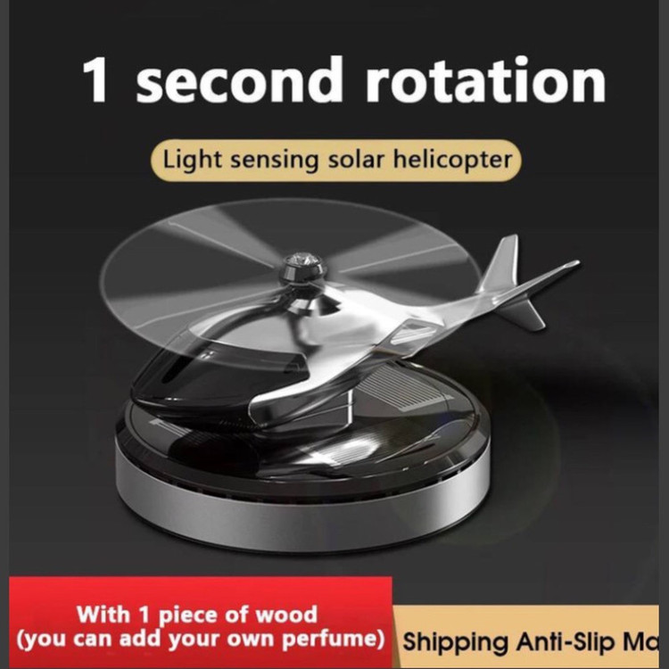 خوشبو کننده هلی کوپتر جدید سولار جزِ جدید ترین خوشبو کننده داخل خودرو می باشد که علاوه بر اسانس ادکلنی قوی قابل شارژ دل بخواه دارای زیبایی منحصر به فرد میباشد که به وسیله انرژی خورشید و نور بدون نیاز به باطری و شارژ باعث چرخش پره های هلی کوپتر میشود و داخل خودرو و روی هر سطح صاف دیگری قابل استفاده میباشد