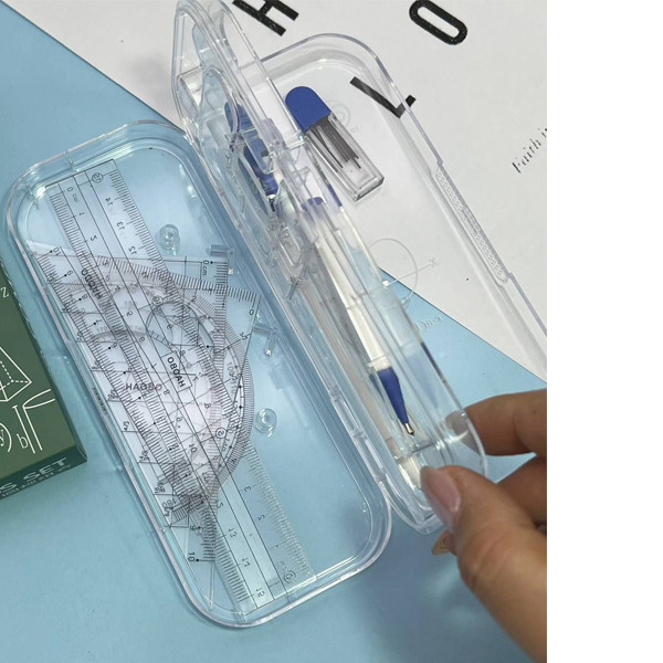 شامل دو عدد گونیا ؛ خط کش ؛ نقاله؛ اتود ؛ پرگار و مغز اتود است و دارای محفظه مناسب برای نگهداری اقلام داخل کیف مناسب برای مدرسه دانشگاه و محل کار می باشد.