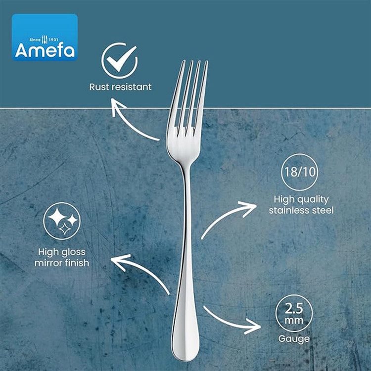 سرویس 24 پارچه Amefa از جنس استیل می باشد که مشتمل بر: 6 عدد قاشق غذاخوری ، 6 عدد چنگال غذاخوری ، 6 عدد کارد غذاخوری ، 6عدد قاشق چای خوری می باشد که ابعاد بسته بندی این محصول به طول 35 سانتیمتر ، عرض 27 سانتیمتر و ارتفاع 5 سانتیمتر می باشد که از بهترین متریال ساخته شده است .