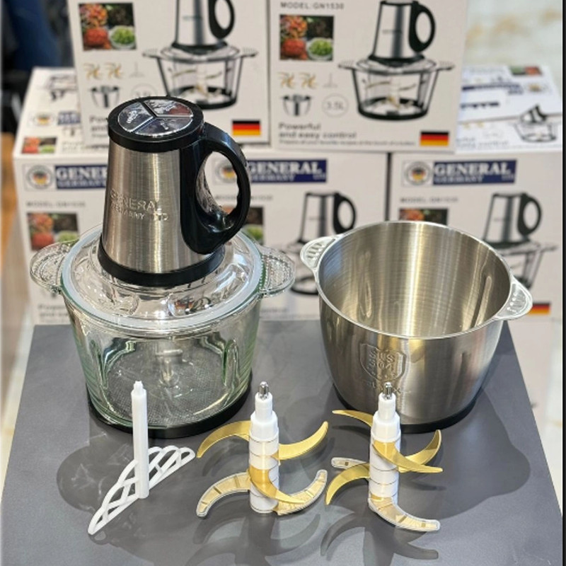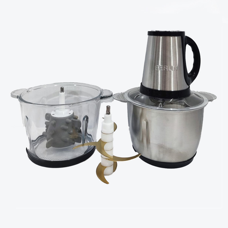 خردکن برلین 999 یک دستگاه چندکاره و پیشرفته است که طراحی و ساخت آن به گونهای است که به راحتی میتواند نیازهای مختلف آشپزی را برآورده کند.این دستگاه دارای دو کاسه استیل ضد زنگ و همچنین پیرکس میباشد تیغه های این دستگاه تیتانیومی و بسیار با کیفیت با عمر طولانی می باشد این دستگاه دارای 6 عدد تیغه می باشد و همچنین یک عدد سیر پوست کن که به راحتی می توان از آن استفاده نمود در داخل پک قرار دارد این خردکن یکی از محبوب ترین ها و میکسرهای خانگی است. این دستگاه به دلیل طراحی کاربرپسند و عملکرد بالا، مورد توجه بسیاری از آشپزها و علاقهمندان به آشپزی قرار گرفته است داری ظرفیت 3.5 لیتر است که براحتی برای همه خانواده ها مناسب هستند این خردکن به ویژه برای افرادی که به دنبال صرفهجویی در زمان و تسهیل فرآیند آمادهسازی غذا هستند، بسیار مناسب است.