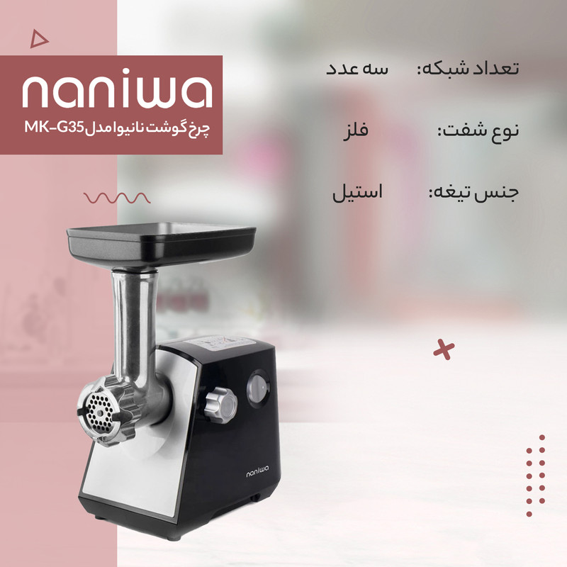 چرخ گوشت تك كاره برند نانيوا مدل MK-G35 تولید شده از سازنده توليدي لوازم خانگي نانيوا، ايران، تك سرعته، بدون نمايشگر، توان مصرفي 180 W، جنس بدنه پلاستيكي می باشد
