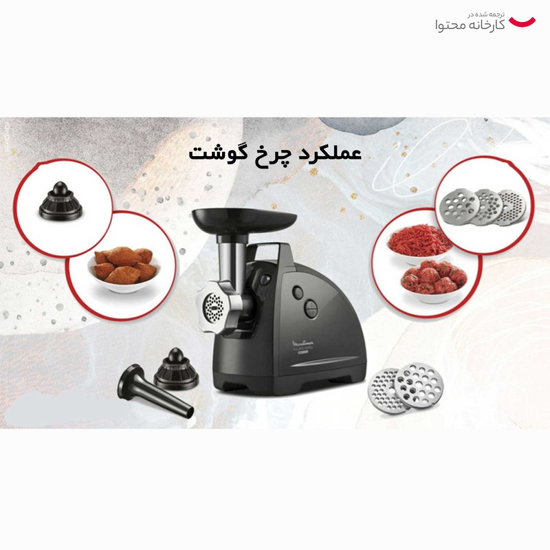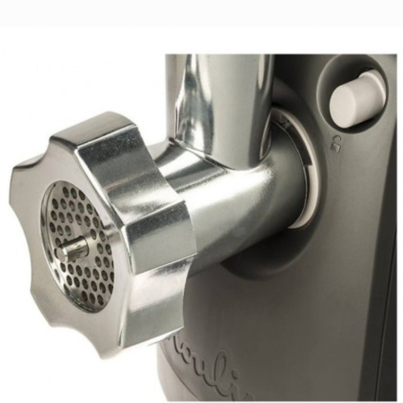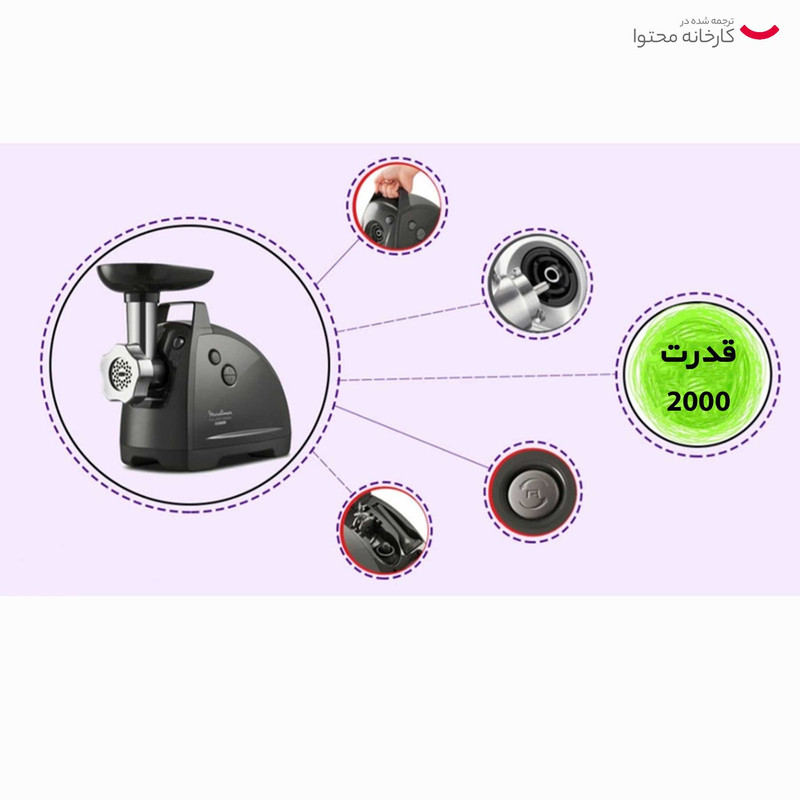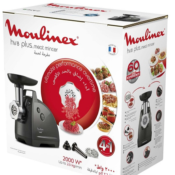 چرخ گوشت مولینکس با قدرت 2000 وات تولید شد. این میزان قدرت همراه با تیغه های تیز و برنده به شاهکاری بی نظیر تبدیل گشت که رکورد 2.5 کیلو مواد غذایی چرخ کرده را در یک دقیقه بر جای گذاشت. همراه با این چرخ گوشت سه صفحه مشبک وجود دارد که اندازه های متفاوتی دارند. جنس تیغه این دستگاه از استیل ضد زنگ بوده که با تیزی فراوان به راحتی هر ماده ای را چرخ می کند. قطعه ی دیگری نیز در این مدل به چشم می خورد که برای درست کردن کبه کاربرد دارد. به علاوه مجهز بودن به قابلیت عملکرد معکوس موجب شده است تا بدون هیچ گیر و گرفتی محتوای چرخ شده به بیرون هدایت شود. به این صورت که اگر چربی یا گوشت در لابه لای چرخ گوشت گیر کند با فشردن کلید برگردان (Reverse) تیغه چرخ گوشت در خلاف جهت حرکت میکند و باعث میشود چربی یا گوشت باقی مانده در لابه لای تیغه ها به راحتی چرخ شود . به طور کلی دستگاه دارای یک سطح سرعت می باشد. دو ویژگی قفل ایمنی و محفظه جایگذاری لوازم جانبی نیز محبوبیت این محصول را دو چندان نموه است.