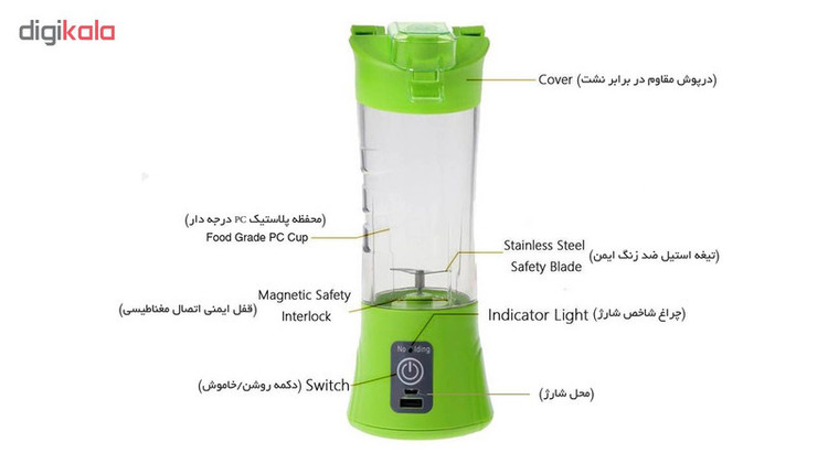 ظرفیت مخزن 380 میلی لیتر، مجهز بودن به قفل اتصال ایمنی مغناطیسی، درب مخصوص برای نوشیدن، بدنه و درب مقاوم به نشت، عدم عملکرد موتور در صورت عدم اتصال مخزن به بدنه، وزن سبک و ابعاد مناسب از دیگر ویژگی های این محصول می باشد.