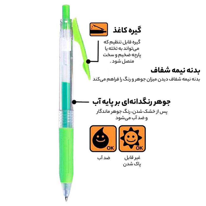 روان نویس زبرا مدل Sarasa Clip با قطر نوشتاری 0.7 برای طیف گستردهای از کارها مناسب است. نوک فلزی محکم آن برای نوشتن در دفترچه یادداشت، یادداشت برداری، لیست نویسی، برنامه ریزی و طراحی بسیار کاربردیست. این رواننویس به صورتی کلیکی کار میکند و با فشردن دکمه انتهای آن امکان استفاده از آن فراهم میشود. رواننویس زبرا Sarasa Clip دارای رنگبندی متنوعی از قبیل آبی، سبز، زرد، قرمز، مشکی، صورتی، قهوهای، نارنجی، سبزآبی و ... است. بنابراین شما میتوانید برای کاربردهای متفاوت رنگ مورد نظرتان را خریداری کنید.