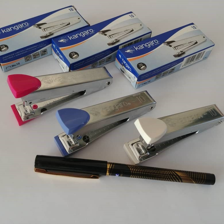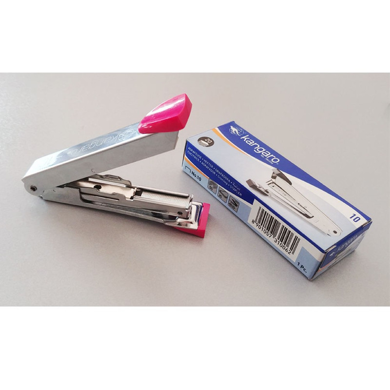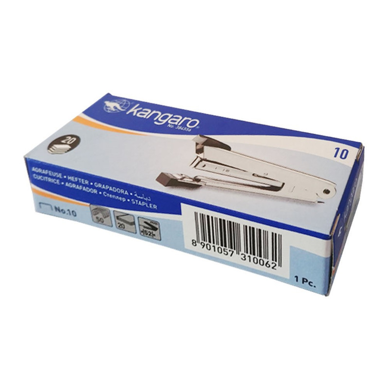 دستگاه منگنه کانگرو مدل No.10 ساخت شرکت با سابقه و مطرح کانگرو هندوستان می باشد، این محصول بدنه ای از جنس فلز دارد که بسیار مقاوم است و دارای ابعاد (95×40×20) میلی متر و وزن 70 گرم می باشد. منگنه کانگرو مدل No. 10 از ظرفیت دوخت 20 برگ کاغذ (80گرمی) برخوردار است و سوزن دوخت شماره 10 در آن قابل استفاده می باشد که در هر بارگیری 50 عدد سوزن درون خود جای می دهد. همچنین عمق ورود کاغذ در این منگنه 52 میلیمتر می باشد. این محصول به صورت دستی عمل می کند و از ابعاد کوچکی برخوردار است که کار با آن را بسیار راحت تر می کند، این منگنه برای کار های روزمره بسیار مناسب می باشد و نسبت به قیمت خود کارایی و کیفیت بالایی دارد.