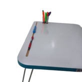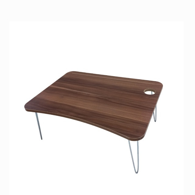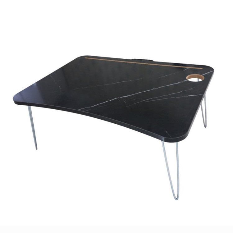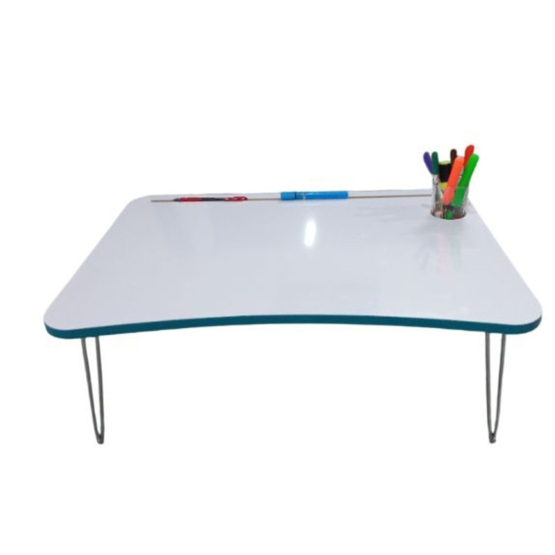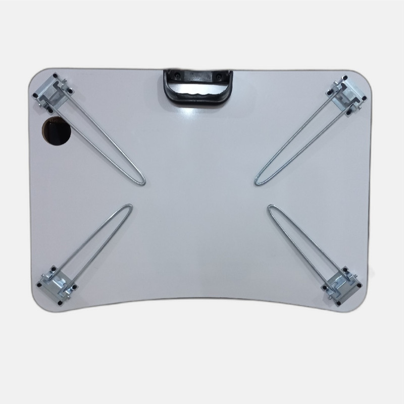 این میز تاشو است و تقریباً برای همه اندازههای لپتاپ تبلت و تلفن مناسب است. همچنین میتوانید آن را بر روی مبل یا زمین بگذارید که میتوانید از آن برای خواندن و نوشتن استفاده کنید. در قسمت بالای این میز به طول ۵۰ سانتیمتر شیار نگهدارنده خودکار طراحی شده است و در سمت راست نیز دایره ای برای نگهداری لیوان طراحی شده است. جنس میز م دی اف درجه یک موجود در بازار ایران است پایههای میز آبکاری شده و از مفتول ۶ میلیمتر استفاده شده است که بسیار محکم و با دوام میباشد. تحمل وزن آن تا ۹۰ کیلوگرم را دارد. این میز بسیار سبک و حمل آن آسان است