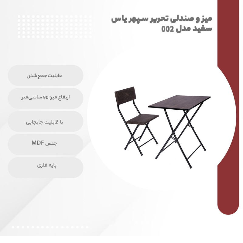 میز و صندلی تحریر سپهر یاس سفید مدل 002 یکی از انواع محصولات این برند است که در رنگ سفید در بازار عرضه شده و طول و ارتفاع آن کاملاً برای استفاده به عنوان میز تحریر دانش آموزان یا دانشجویان مناسب است. این میزها علاوه بر اینکه رنگ کاملاً سفیدی دارند؛ کیفیت بسیار بالایی هم داشته و به همین خاطر اغلب افراد تمایل دارند که از میز و صندلی تحریر سپهر یاس سفید به عنوان یک نمونه با کیفیت در منزل خود یا کلاسهای آموزشی تهیه کنند. همچنین میز سفید این برند به دلیل رنگ خاص و پرطرفدار جزو محصولات پرفروش فروشگاه اینترنتی دیجی کالا است.