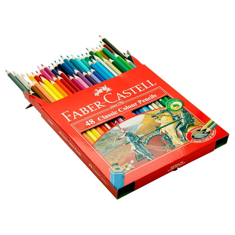 یکی از مداد رنگیهای مشهور در دنیا، مداد رنگی کلاسیک فابر کاستل است. بدنهی این مداد رنگی به کلاسیکترین شکل ممکن مداد – یعنی ششضلعی- طراحی و از جنس چوب ساخته شده است. این بدنهی شش ضلعی به مداد شکل ارگونومیکی داده است که در استفادهی طولانی مدت دست را خسته نمیکند و به آن آسیبی نمیزند. شش ضلعی بودن بدنه از لیز خوردن مداد در دست یا روی میز هم جلوگیری میکند.نوک این مدادها در برابر فشار بسیار مقاوم است و نمیشکند. بهعلاوه تمامی رنگهای موجود در این بسته48 عددی درخشان و شفاف هستند. این رنگها را میتواند به سرعت و به آسانی با هم ترکیب کرد.مزیت مهم این مداد رنگیها، دوام رنگشان است. با این ویژگی شما میتوانید نقاشیهای کودک خود را برای سالهای طولانی نگه دارید. مداد رنگی کلاسیک فابر کاستل کاملاً غیر سمی است و شما دیگر نگران مسموم شدن کودکتان در صورت تماس مداد رنگی با دهان یا چشم او نخواهید بود.در بستهبندی مقوایی این مداد رنگی یک تراش نیز به عنوان هدیه قرار داده شده است.