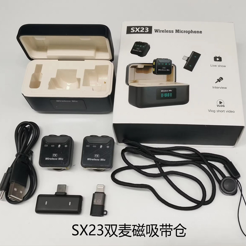 میکروفون بی سیم دو کاناله SX23 یک گزینهی کاربردی برای تولید محتوا با گوشی موبایل است. این محصول دارای دو فرستنده و امکان استفادهی همزمان برای دو کاربر است که هریک از آنها میتوانند تا ۱۵ متر دورتر از گیرنده قرار گیرند. به همراه این محصول کابلهای اتصال مستقیم به انواع گوشی اندرویدی و آیفون ارائه شده که مزیت بزرگی برای یک میکروفن بیسیم در این ردهی قیمت محسوب میشود. طراحی این محصول بسیار مدرن و پیروی ترند این روزها یعنی بدنهای مربعیشکل است. میکروفون بی سیم دو کاناله SX23 دارای گیرهی متصل به بدنه و باتری داخلی با ۱۲ ساعت شارژدهی هستند که از طریق درگاه Type-C روی بدنهی آنها و کابل ارائه شده به همراه محصول شارژ میشوند. از مزایای فنی این محصول میتوان به وجود خروجی هدفون برای مانیتورینگ صدا و امکان کاهش یا فزایش صدای خروجی اشاره کرد. ارتباط بین قطعات فرستنده و گیرنده در این محصول از طریق امواج 2.4GHz صورت میگیرد و تاخیر ارسال صدا ۳۰ میلیثانیه برآورده شده که بسیار ناچیز است. همچنین میکروفنها دارای سه حالت صدابرداری آکوستیک، دارای اکو و بدون نویز هست که خصوصاً حالت بدون نویز یا "نویزکنسلینگ" یکی از حالتهای پرکاربرد برای تولید محتوا در محیطهای شلوغ است