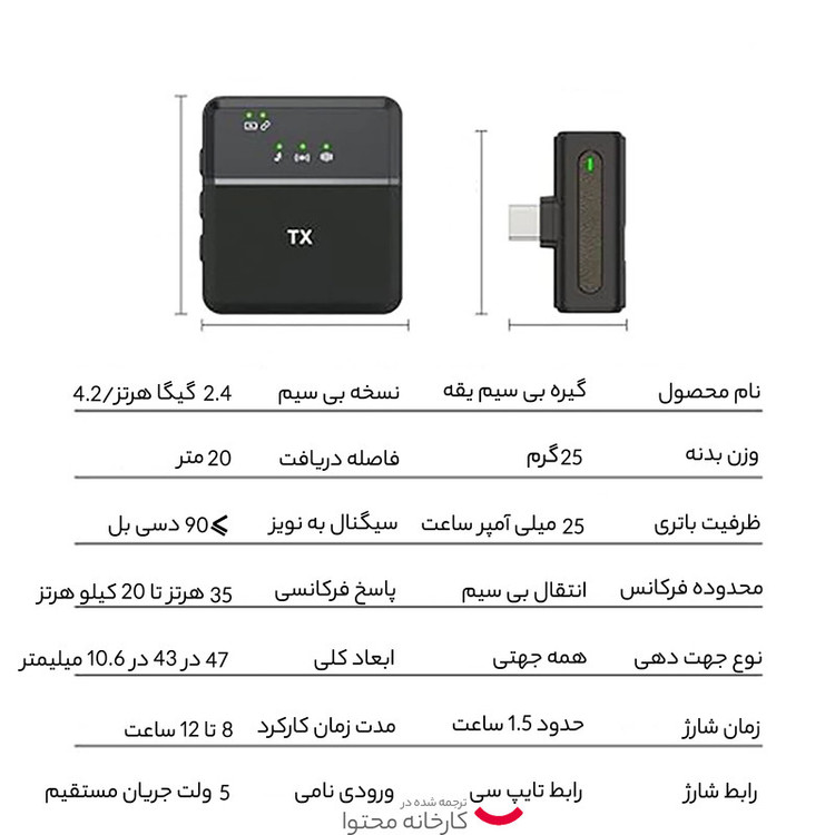 SX8 Type-C یک میکروفن بی سیم یقه ای مناسب انواع گوشیهای موبایل ، تبلت و لپ تاپ مجهز به درگاه یو اس بی تایپ سی USB-C میباشد . نوع میکروفن لاوالیر lavalier کندانسر الکتریکی بوده که بصورت 360 درجه صدا را جذب میکند. این دستگاه بدون نیاز به هیچ گونه نرم افزار به گوشی شما متصل شده و صدا را با کیفیت بسیار عالی و شفاف به گوشی منتقل میکند . سیستم هوشمند حذف نویز این میکروفن بهترین کیفیت دریافت صدا در محیط های شلوغ و هنگام وزش باد در محیط باز را تضمین میکند . به لطف تکنولوژی 2.4GHZ انتقال صدا بدون هیچگونه تاخیری انجام میشود . شعاع عملکرد این میکرفن 25 متر ( بدون مانع ) و مدت زمان شارژ دهی آن 12 ساعت میباشد . فقط کافیست که قطعه گیرنده را به انتهای گوشی خود ( درگاه یو اس بی تایپ سی USB-C ) متصل کرده و میکرفن را روشن کنید ، بصورت کاملا خودکار فرستنده و گیرنده به یکدیگر متصل شده و شروع به کار میکنند . این دستگاه مناسب برای لایو استریمینگ ، کلاسهای آنلاین آمورشی ، ساخت ویدیو های آموزشی و تبلیغاتی و در آخر ولاگینگ میباشد