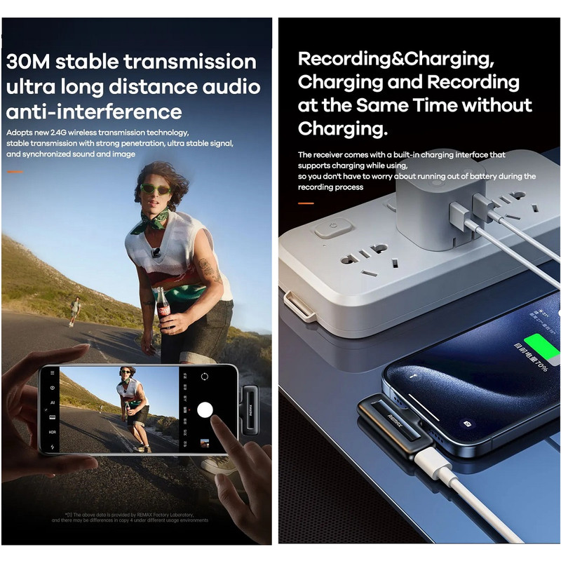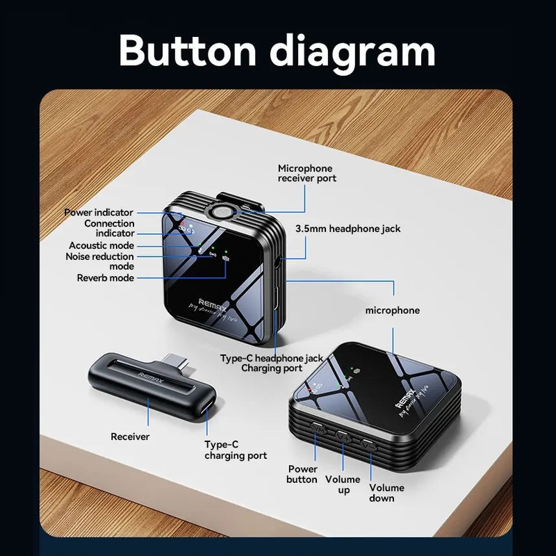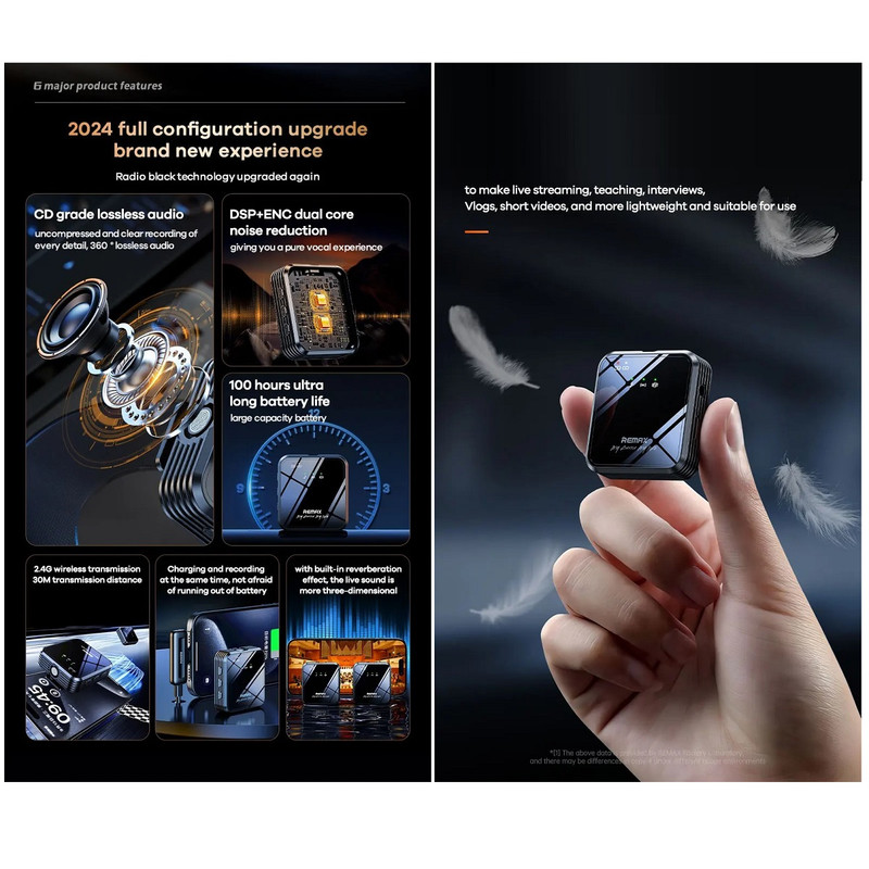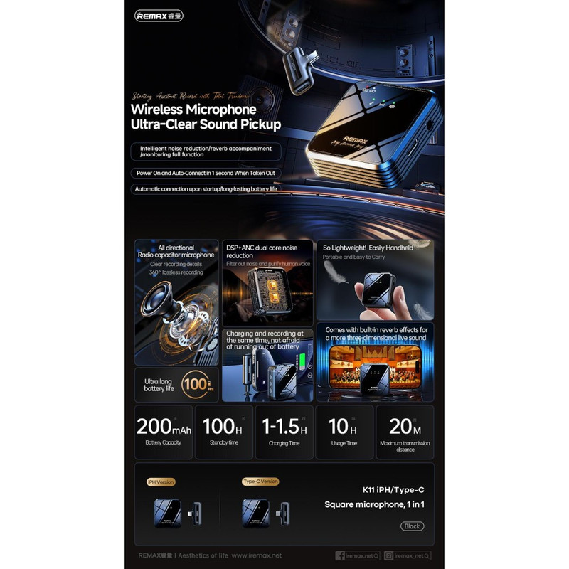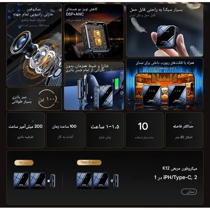 میکروفون بیسیم یقهای ریمکس مدل K12 دوکاربره (استفاده دونفر همزمان) بسیار سبک و درعین حال مقاوم بوده ومیتواند با تمامی گوشی های اندروید،آیپد و تبلت (سوکت نوع C)، پخشکننده صوتی خودرو،دوربین ،آمپلی فایرها،تجهیزات صوتی ودستگاه ساب ووفر،کارت صدا ودیگر وسایل سازگار با آن وصل شود.این محصول مجهزبه میکروفون از نوع خازنی رادیویی تمام جهته است که میتواندجزئیات ضبط واضح و 360 درجه بدون افت کیفیت صدا را ارائه دهد.تافاصله 20 متری از گوشی کار میکند وبا شارژ 1تا 1.5ساعته باتری آن 10الی 15ساعت شارژ نگه داشته وتا 100 ساعت درحالت آماده بکارمی ماند.همچنین این میکروفون قابلیت Real time monitoring می باشد ومیتوانید با اتصال یک هدفون به گیرنده آن صدای درحال ضبط را به صورت زنده مانیتورکنید.این میکروفون دارای کیفیت وشفافیت صدای کریستالی بالا درضبط است ومیتوانید ازحالتهای مختلف ضبط صدای این محصول برای انجام کارهای مختلف ازجمله تولیدمحتوا،مصاحبه های دونفره،بلاگری،ضبط پادکست،میزگردها،خوانندگی ونوازندگی، لایو استریم،جلسات وکلاسهای مجازی استفاده کرد.این محصول ازتکنولوژی2.4GHZ برای انتقال صدااستفاده میکندکه باعث میشودصدا بدون تاخیربه گوشی برسد.این میکروفون مجهزبه تکنولوژی کاهش نویز دوهسته ایی NFCوDSP می باشدکه نویز را فیلتر کرده وصدای انسان را تصفیه وشفاف میکندبنابراین شما میتوانید این محصول را برای استفاده درفضای بسته وحتی محیط باز وپر سر وصدا بکار بگیریدوشاهد ضبط یک صدای باکیفیت وبا کمترین نویزباشید.همچنین این میکروفون دارای سه حالت مختلف یعنی حالت عادی باصدای شفاف، حالت نویز کنسلینگ برای کاهش صدای محیط و حالت ریورب یا اکو صدایی حرفهای به ضبطهای شما اضافه میکند.این ویژگیها بشما کنترل کاملی بر ضبطهایتان میدهد.با دوبارفشردن دکمه خاموش وروشن میتوانیدحالت استندبای یا وقفه صدا راتجربه کنید تانیاز به ادیت و ویرایش وبرش در برنامهای مختلف نداشته باشید.بطور خودکاربهم متصل میشوند،بنابراین نیازی به برنامه کاربردی وبلوتوث نیست.فقط فرستنده رابه دستگاهها (پورت تایپ C) وصل کنید ومستقیماً استفاده کنید.کیفیت صدای استریوی کامل و حرفهای ۴۴.۱ تا۴۸کیلوهرتز را ارائه میدهد و قدرت فرکانس آن 6برابر میکروفونهای مونو معمولی است.میکروفون بیسیم یقهای ریمکس مدل K12 دارای استانداردهای CE-FC-RoHsمی باشد.