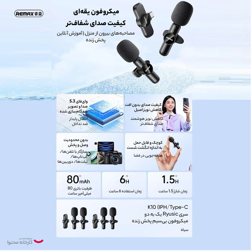 میکروفون بی سیم K09-Type Lightening یک راه حل جامع برای بهبود کیفیت صدا در فیلمبرداری و پخش زنده بر روی گوشی، کامپیوتر و دوربین است. با بلوتوث پیشرفته و فن آوری حذف نویز، صدای خالص و پیشرفته ای دریافت خواهید کرد که نیازهای شما را در سناریوهای مختلف ضبط برآورده می کند.به لطف فناوری بلوتوث پیشرفته می توانید از ضبط بی سیم و آزادی حرکت به دور از کابل های مزاحم لذت ببرید.میکروفن یقه ای بیسیم ریمکس مدل K09- IPHONE مناسب برای انواع گوشیهاو تبلتها ، کامپیوترها و لپ تاپها و دوربین های عکاسی و سایردستگاههای دارای درگاه اتصال سوکتی از نوع لایتنینگ(آیفونی) میباشد. عملکرد این دستگاه مجهزبه سیستم هوشمند کاهش نویز بسیار عالی صدای واقعیست و دارای عملکرد همگامسازی صدا بدون وقفه و ارسال صدای حرفهای با باند کامل با کیفیت استریو می باشد.نوع میکروفن لاوالیر lavalier کندانسر الکتریکی بوده که بصورت 360 درجه صدا را جذب میکند. این دستگاه بدون نیاز به هیچ گونه نرم افزار به گوشی شما متصل شده و صدا را با کیفیت بسیار عالی و شفاف به گوشی منتقل میکند .میکروفون Remax K09 Lightening دارای قابلیت حذف نویز است که یک ویژگی عالی بوده که به کاهش نویز خارجی و تمرکز بر ضبط صدای واضح و مشخص کمک می کند.ضبط های صوتی واضح و پیشرفته را حتی در محیط های با نویز بالا به شما می دهد. این صدایی شفاف و قدرتمند با جهت دهی انعطاف پذیر به شما می دهد و آن را به انتخابی ایده آل برای بهبود کیفیت صدای شما و افزایش حرفه ای بودن تبدیل می کند.به لطف تکنولوژی وایرلسی 2.4GHZ انتقال صدا بدون هیچگونه تاخیری انجام میشود . شعاع عملکرد این میکرفون بسته به مانع از 10 الی 20 متر بوده و قابلیت فست شارژ دارد و با یک شارژ 1 الی 1.5 ساعتی قابلیت استفاده 6 الی 8 ساعتی را دارا می باشد.در این مدل فقط کافیست قطعه گیرنده را به انتهای گوشی خود ( درگاه Lightening) متصل کرده و میکروفون را روشن کنید ، بصورت کاملا خودکار فرستنده و گیرنده به یکدیگر متصل شده و شروع به کار میکنند.در قسمت پایه متصل به دستگاه قابلیت اتصال به شارژر و شارژ نمودن گوشی بصورت همزمان را نیز دارد . این دستگاه مناسب برای انواع لایو استریمینگ ها ، کلاسهای آنلاین آمورشی ،مصاحبه ها، یوتیوپ،ساخت ویدیو های آموزشی و تبلیغاتی،سخنرانی ها و در آخر ولاگینگ میباشد .