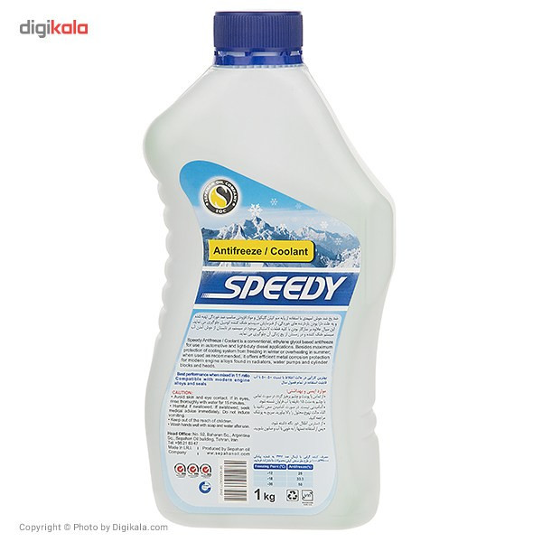 ضدیخ خودروی «اسپیدی» (Speedy)با وزن 1 کیلوگرم به بازار عرضه شده است. این محصول را باید با نسبت 50 درصد با آب مخلوط کنید تا برای استفاده آماده شود. با اضافهکردن این محصول به سیستم خنککنندهی خودرو، بهسادگی از یخزدگی آب موجود در سیستم خودروی خود جلوگیری کنید. این محصول قادر است هم دمای نقطهی انجماد آب را پایین بیاورد و هم دمای نقطهی جوش آن را بالا ببرد؛ به این ترتیب هم از یخزدن آب و هم از جوشآمدن آن جلوگیری میکند. این محصول بر پایهی اتیلن گلیکول و مواد افزودنی مناسب جهت مصرف در سیستم خنککنندهی خودروهای بنزینی و دیزلی ساخته شده است. از ویژگیهای منحصربهفرد این محصول سازگاری کامل آن با قطعات لاستیکی و تمامی واشرهاست که باعث میشود در اثر استفاده از محصول و بهمرور زمان، مشکلی برای قطعات داخلی سیستم خنککننده بهوجود نیاید. در تهیهی ضدیخ از موادی استفاده شده است که قادرند از سیستم خنککاری و تمامی قطعات موجود در آن دربرابر زنگزدگی و خردگی محافظت کنند.