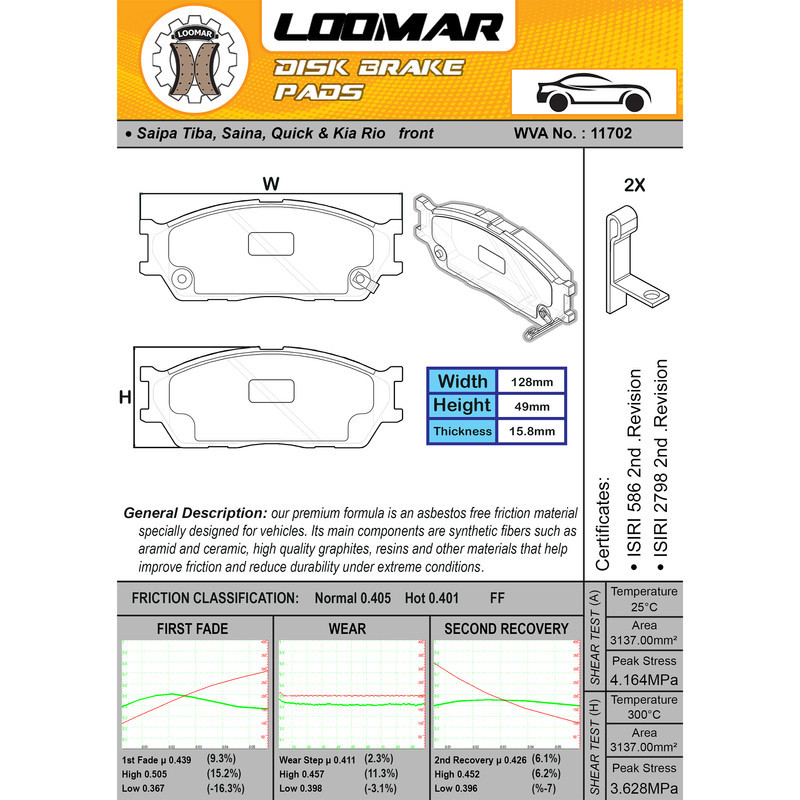 لنت ترمز جلو لومار مدل 400092 مناسب برای کوئیک