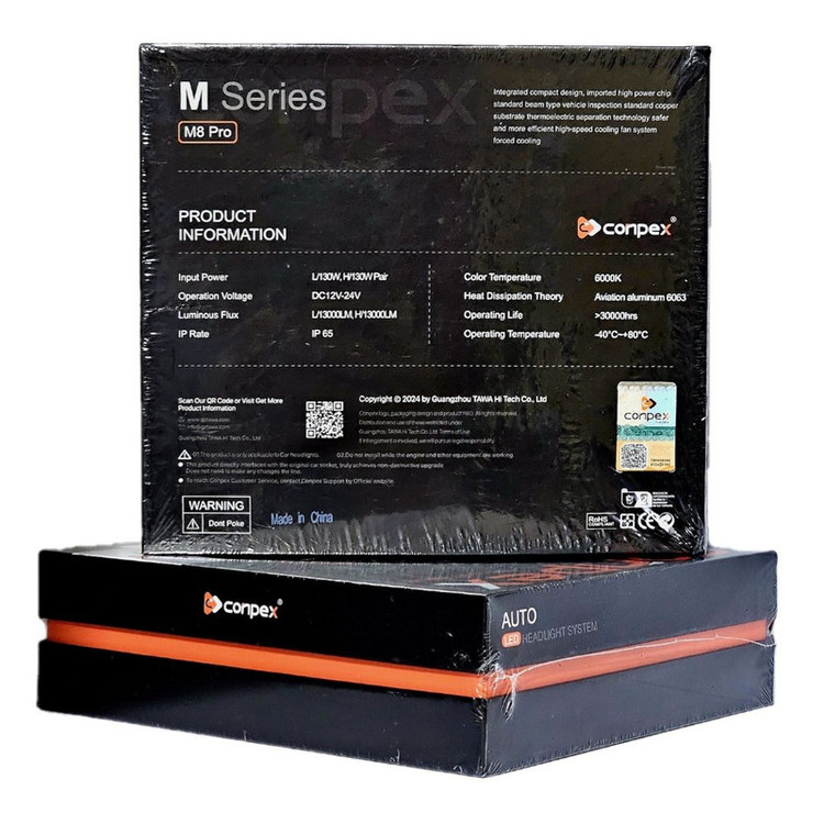 هدلایتهای کانپکس نسبت به نسل قدیمی خود در سری ساخت 2024 تکامل یافته و از توان نور دهی و روشنایی و قدرت وات بالاتر برخوردار میباشد همچنین سیستم خنککنندگی به خوبی طراحی و توسعه داده شده بطوری که با قرار گیری یک فن خنک کننده در پشت بدنه آن به صورت هوشمند بر روی یک هیت سینگ بهره میبرد.میزان بازدهی نوری هدلایت کانپکس M8 pro چیزی در حدود 13 هـزار لومن انداره گیری و ارزیابی شده است که این مورد بر روی جعبه نیز نوشته شده و همچنین مصرف هر لامپ هدلایت 65 (130W جفت) وات می باشد که در مقایسه با نسل قبلی خود ارتقا یافته است. این هدلایت دارای گواهی (ip65) است و میتواند در شرایط آب و هوایی و جوی مختلف به خوبی کار کند که از 40- تا 80+ درجه سانتیگراد ارزیابی شده و دارای طول عمر 30000hrs هزار ساعت است.هنگام خرید این هدلایت به برچسب اصالت کالا در پشت جعبه توجه فرماید.