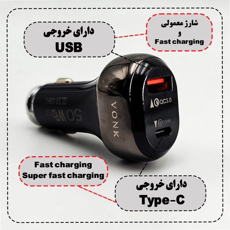 شارژر فندکی VC-50 از برند VONK این محصول جدید و باکیفیت، محصول در سال 2025 طراحی شده است و تمام بروزرسانی های گوشی های جدید سازگاری دارد ( iOS و Android ) و قابلیت شارژ معمولی ، شارژ سریع(Fast Charging) و شارژ خیلی سریع (Super Fast Charging ) و به شما امکان میدهد تا متناسب با نیازتان استفاده کنید ، این فندکی دارای دو خروجی Type-C و USB هست و یک کابل یک متری LED دار Type-C هم داخل جعبه وجود دارد.