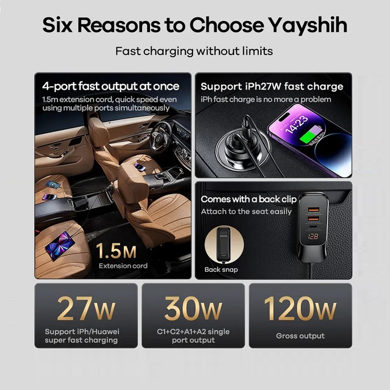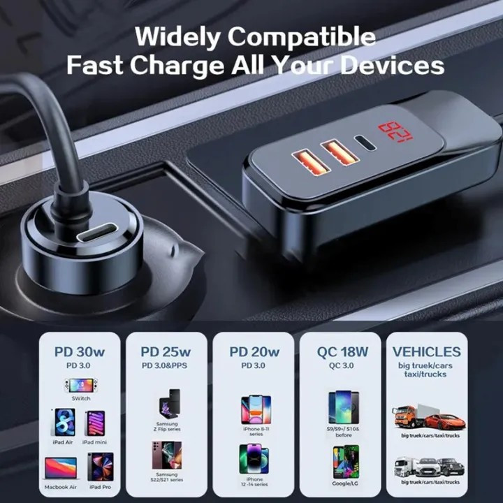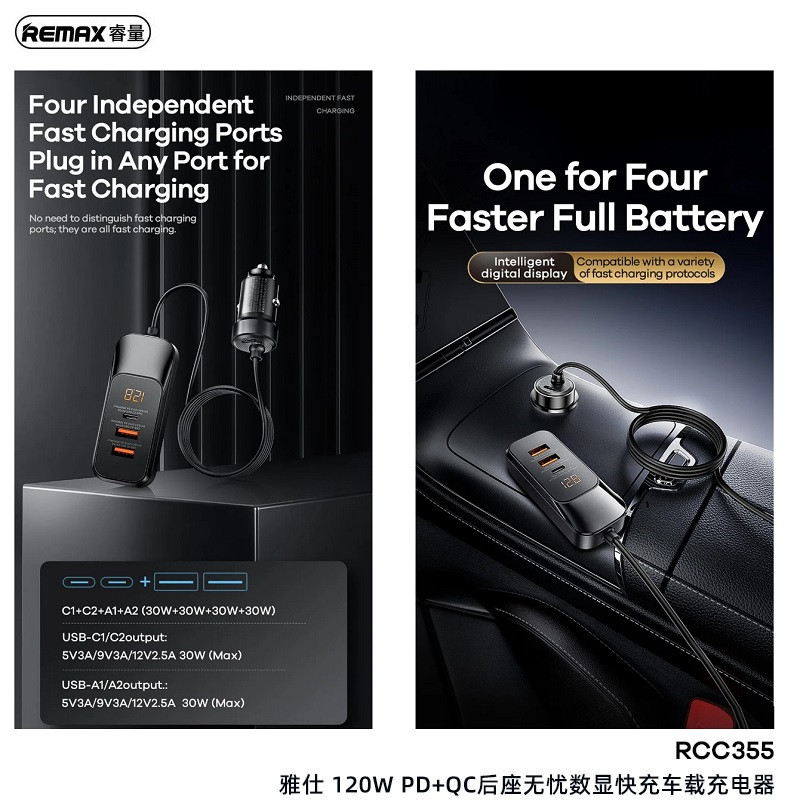 با شارژر فندکی فوق سریع Remax 120W PD QC RC-C355، تمام دستگاههای خود را در خودرو روشن نگه دارید و شارژ کنید.با قابلیت شارژ سریع، پورتهای اتصال متعدد، که ایمنی شارژ را تضمین میکند، قطعاً یک وسیله جانبی ضروری برای تأمین سریع و مؤثر برق دستگاههای الکترونیکی در خودرو است.این محصول جمع و جور به شما امکان میدهد تا به راحتی آن را روی هر پریز برقی در خودرو نصب و جدا کنید و فضای زیادی را اشغال نمیکند. میتوانید به راحتی آن را در کیف و کوله پشتی خود هنگام بیرون رفتن یا عدم استفاده حمل کنید.پوسته بیرونی محصول از پلاستیک با کیفیت بالا با استحکام و دوام خوب ساخته شده است. لایه بیرونی پلاستیک با رنگی براق پوشانده شده است که ضد اثر انگشت و ضد خش است و به محصول کمک میکند تا مانند روز اول نو بماند.این طراحی برای خودروهایی که پورت شارژ در پشت ندارند بسیار مناسب است. فقط کافی است آن را به کیف نگهداری پشت صندلی وصل کنید تا ثابت شود و براحتی آماده شارژ شود. با طول کابل تا ۱.۵ متر، فاصله اتصال نامحدود و عدم گره خوردن هنگام شارژ در خودرو.شارژر Remax RCC-355 با حداکثر ظرفیت 120 وات، امکان شارژ سریع 4 دستگاه تلفن همراه از iOS گرفته تا اندروید را به طور همزمان بصورت فست شارژ و PD (Power Dlivery) فراهم میکند. این شارژر فندکی قدرتمند دارای چهار پورت شارژ سریع مستقل، شامل ۲ پورت USB-A و ۲ پورت Type-C است که هر پورت تا 30 وات برای شارژ فوقالعاده سریع فراهم میکند و در مجموع خروجی چشمگیر ۱۲۰ وات را ارائه میدهد.مجهز به یک خروجی شارژ در قسمت جلو خودرو و با کابل بلند ۱.۵ متری سیلیکونی، با سه پورت میتوانید به راحتی به صندلیهای عقب دسترسی داشته باشید و این امر آن را برای سفرهای طولانی با خانواده یا دوستان ایدهآل میکند.این شارژر با یک حلقه آلیاژ آلومینیومی براق و بدنه بادوام PC طراحی شده است و در عین حال ظاهری مدرن و ممتاز را حفظ میکند. هر پورت تا ۳۰ وات قدرت شارژ سریع ارائه میدهد و چندین دستگاه را به طور همزمان به طور موثر شارژ میکند. چه تلفنهای هوشمند اندرویدی و آیفونی، تبلت یا لپتاپ باشد، این شارژر تضمین میکند که همیشه آماده استفاده هست.شارژر فندکی فوق سریع Remax 120W PD QC RC-C355 دارای گواهینامه استانداردهای بینالمللی FC، CE، RoHs می باشد.