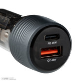 طراحی بدنه این شارژر از جنس باکیفیت و مقاوم ساخته شده و ظاهر شفاف و مدرن آن، جلوهای خاص به فضای داخلی خودرو میبخشد. دو پورت خروجی USB یکی تایپسی و دیگری USB-Aبه شما این امکان را میدهد که بهصورت همزمان دو دستگاه رابدون کاهش سرعت یا توان خروجی شارژ کنید.