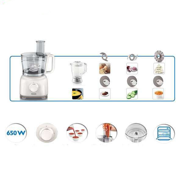 همچنین این غذا ساز فیلیپس دارای رنده های متعددی از جمله رنده دو طرفه با رنده ریز و درشت و برش دهنده می باشد. این غذاساز دارای خمیرزن و همزن که برای تهیه انواع نان و همزدن انواع سسها،خامه و خمیرهای سبک مناسب می باشد.