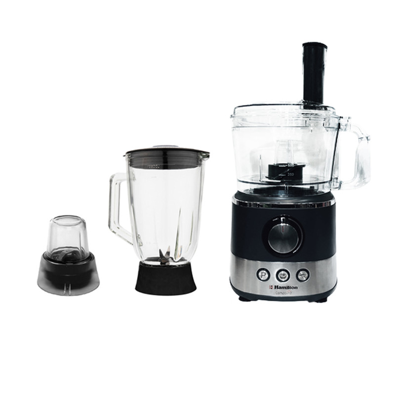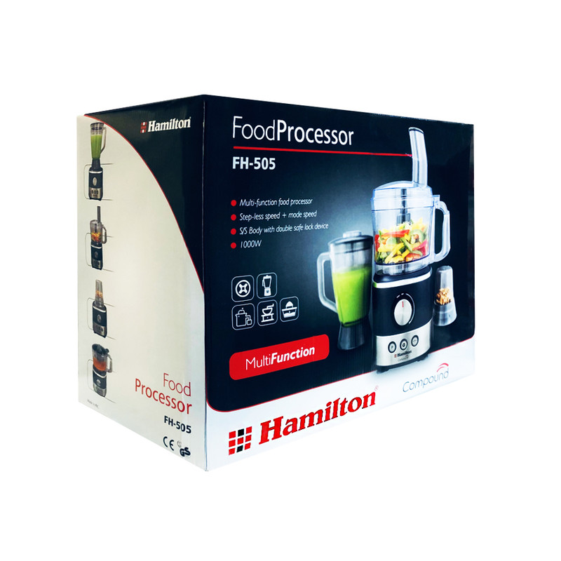 غذاساز همیلتون مدل 505 از سری غذاساز های 9 کاره برند همیلتون است. ظرف خردکن این غذاساز از جنس پلاستیک است و 2 لیتر حجم دارد که 1.2 لیتر آن قابل استفاده می باشد. که این 1.2 لیتر بر روی این ظرف مدرج شده و حجم مواد غذایی را میتوان بوسیله آن حدس زد. جنس مخلوط کن این محصول از شیشه می باشد و 1.8 لیتر حجم دارد و تیغه آن نیز از جنس استیل ضدزنگ می باشد. این دستگاه دارای آسیاب نیز می باشد که بدنه آن از پلاستیک و تیغه آن استیل ضدزنگ است. از دیگر عملکرد های غذاساز همیلتون مدل 505 می توان به دیسک رنده آن اشاره کرد که 3 رنده مختلف دارد؛ رنده نگینی، رنده درشت و رنده ریز. سری آب مرکبات گیری که برای انواع مرکبات مانند پرتقال، گریپ فروت، نارنج و ... مناسب است یکی دیگر از ویژگی های این محصول است. این دستگاه همچنین دارای تیغه پلاستیکی ورز دهنده (مخلوط کننده مواد غذایی سفت مانند مایه خمیر) می باشد. که مجموعه این عملکردها در نهایت 9 کار مختلف برای شما انجام میدهد. بوسیله کلید ولومی بر روی این دستگاه شما به6 سرعت مختلف و همچنین عملکرد پالس (لحظه ای) دست پیدا میکنید. در پایان باید ذکر کرد که توان مصرفی موتور این دستگاه 1000 وات است و برای آن کلید دوبل ایمنی طراحی شده که استفاده از آن را بیش از پیش امن میکند.